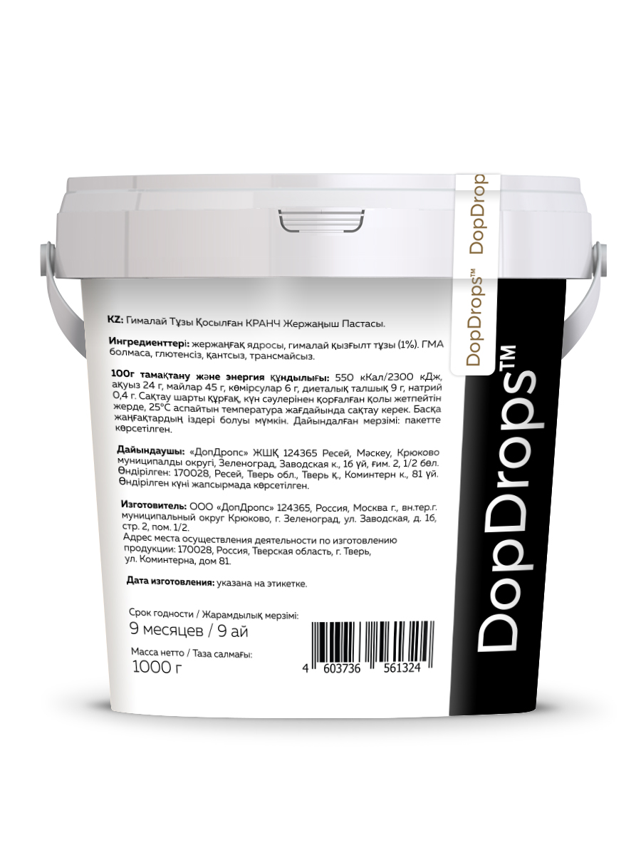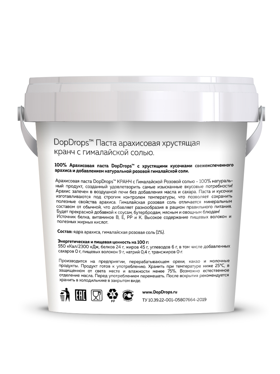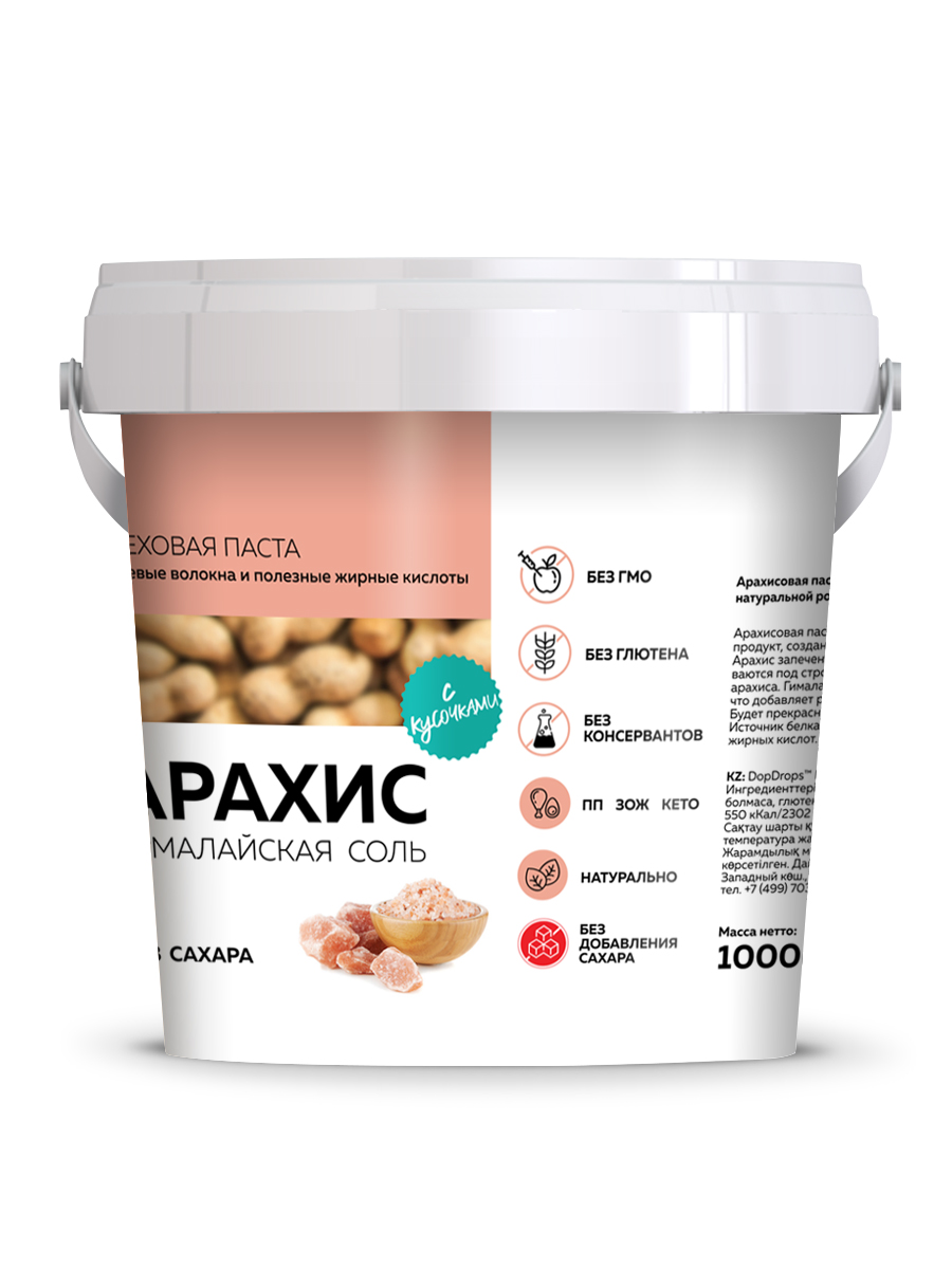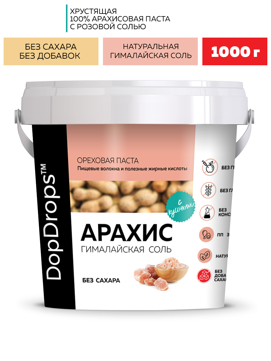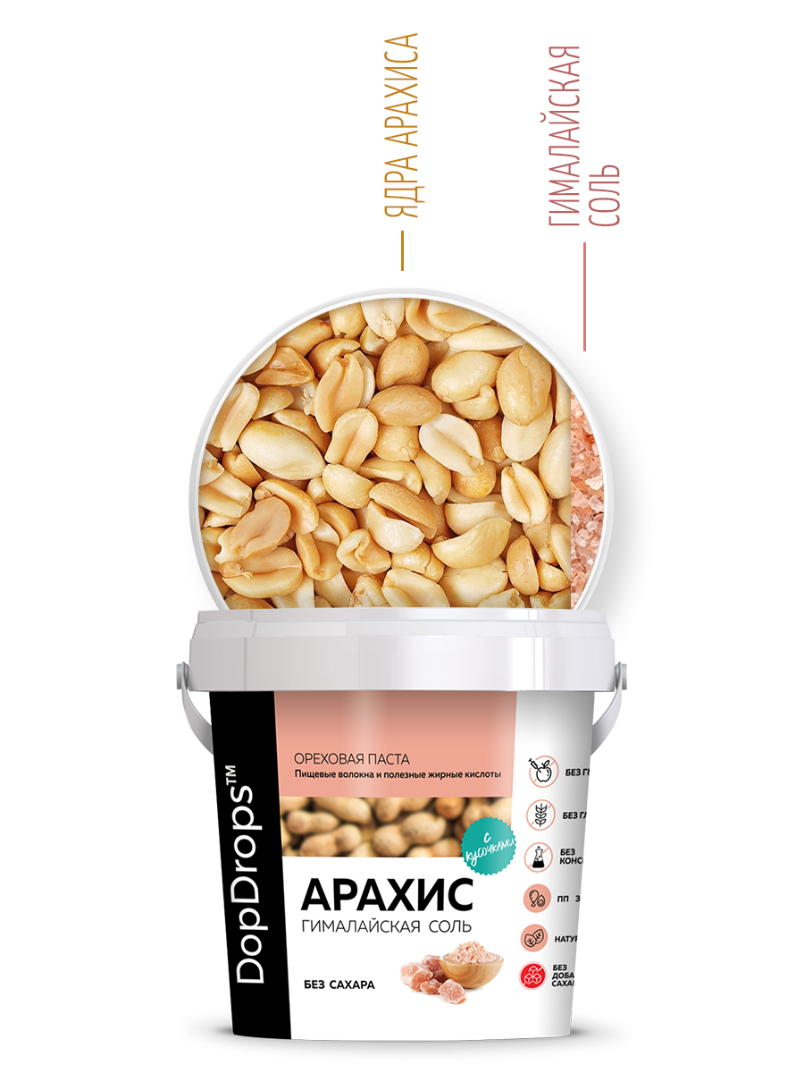 Арахисовая паста кранч с солью DopDrops — это натуральная ореховая паста без сахара, приготовленная из цельного арахиса премиум-сорта с добавлением гималайской розовой соли. Благодаря собственной технологии производства, арахис сохраняет все полезные свойства, витамины и микроэлементы. В составе только арахис и гималайская соль — никаких ГМО, глютена, лактозы, пальмового масла или искусственных добавок.