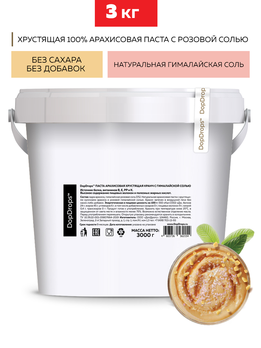 Арахисовая паста кранч с солью DopDrops — это натуральная ореховая паста без сахара, приготовленная из цельного арахиса премиум-сорта с добавлением гималайской розовой соли. Благодаря собственной технологии производства, арахис сохраняет все полезные свойства, витамины и микроэлементы. В составе только арахис и гималайская соль — никаких ГМО, глютена, лактозы, пальмового масла или искусственных добавок.