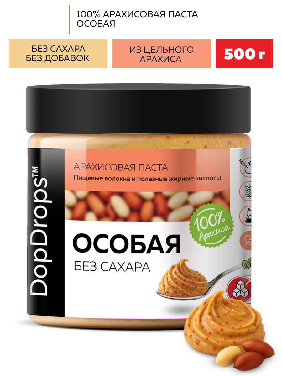 Арахисовая паста особая - это натуральное лакомство, которое станет идеальным дополнением вашего здорового рациона. Пасты ДопДропс – вкусные и натуральные продукты без сахара и глютена для тех, кто ценит качество и следит за своим здоровьем.