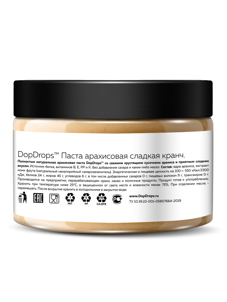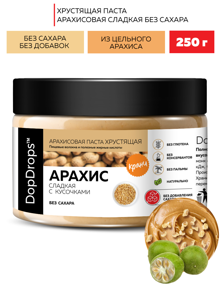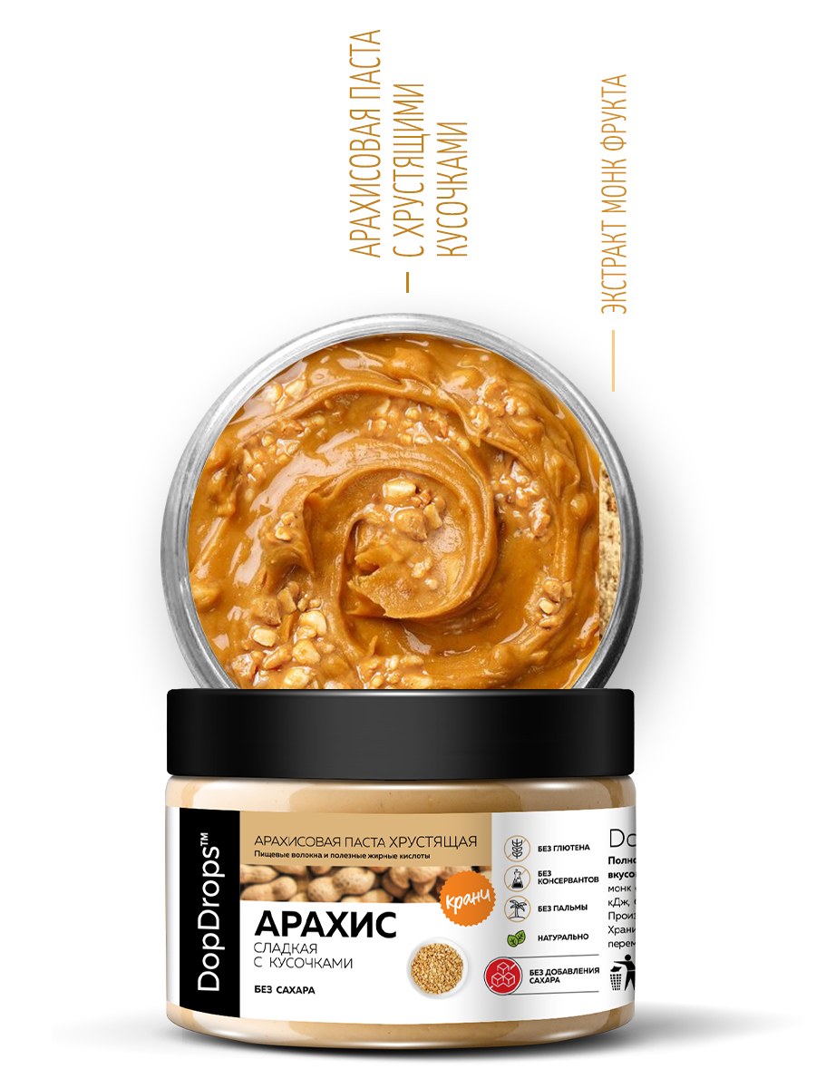 Арахисовая паста сладкая с хрустящими кусочками от DopDrops – это не только вкусный, но и полезный продукт с огромным количеством витаминов и необходимых микроэлементов. Сладкая, но без сахара, уникальная по своим свойствам. В этой пасте сочетается легкая естественная и приятная сладость и нежная текстура перемолотого арахиса с хрустящими кусочками.