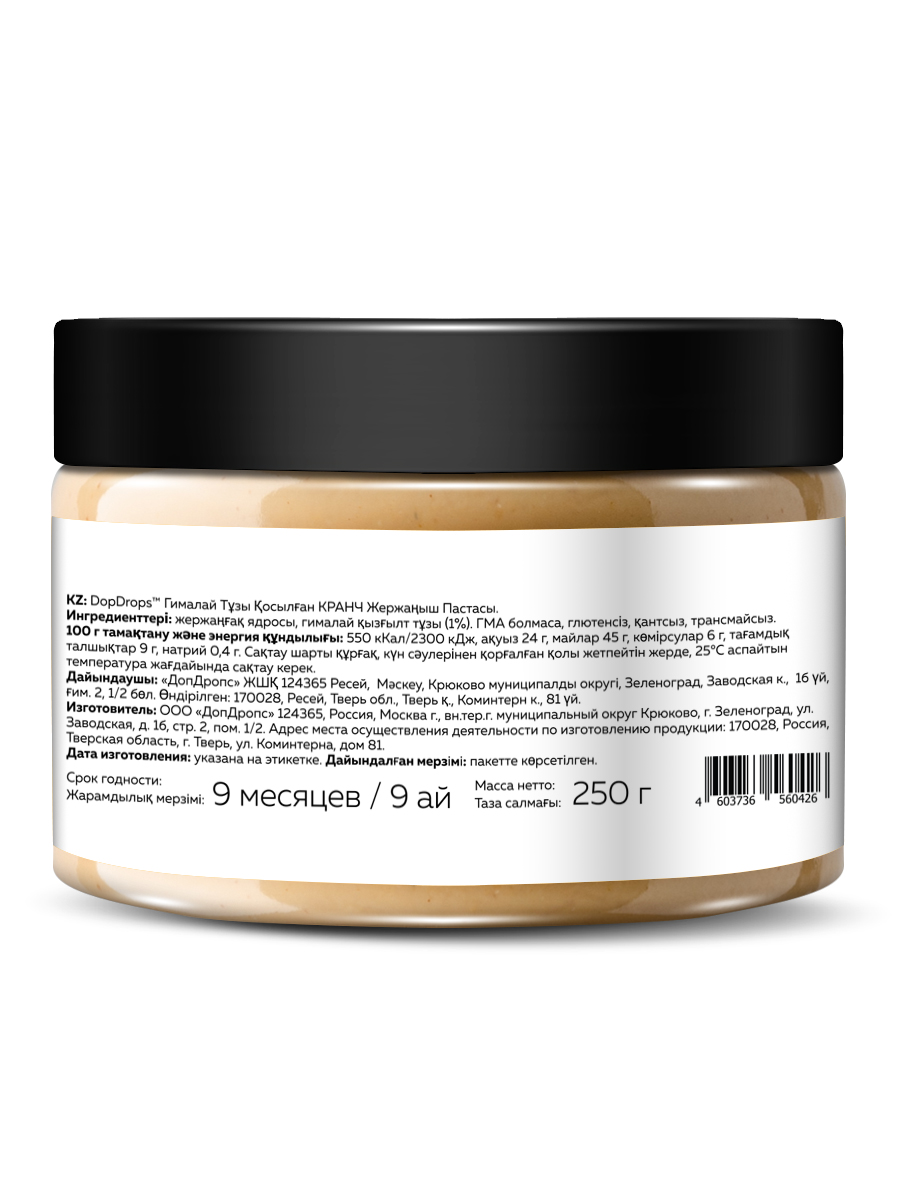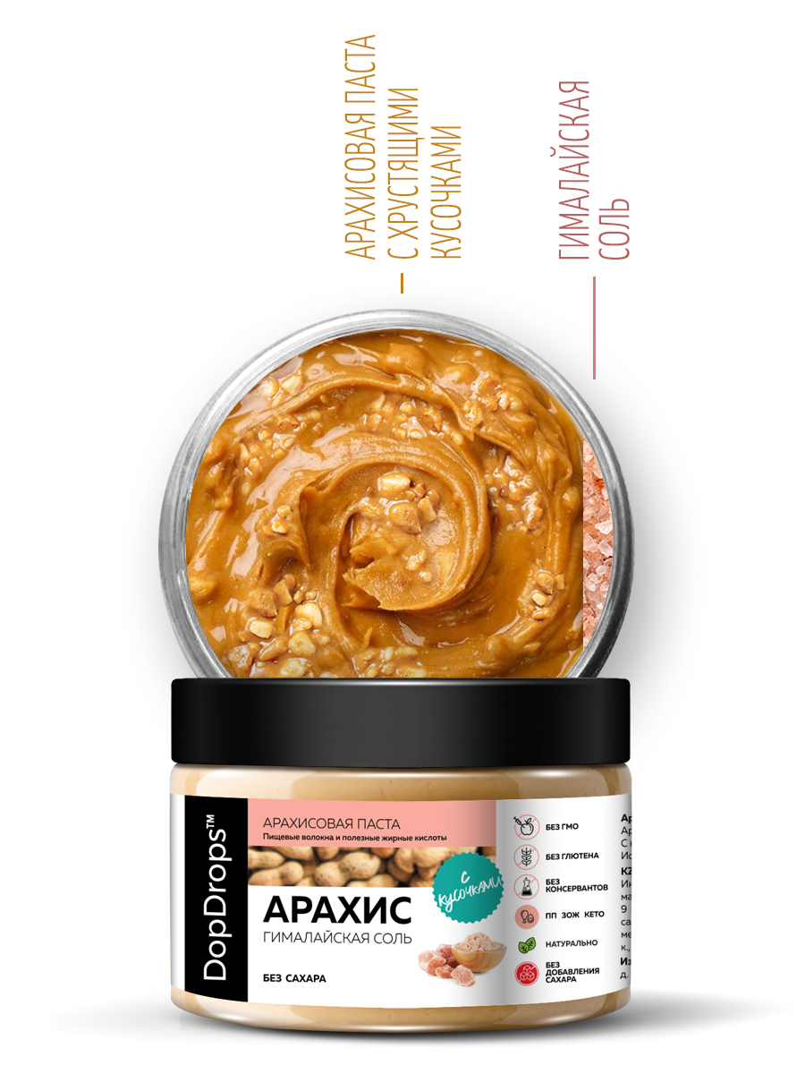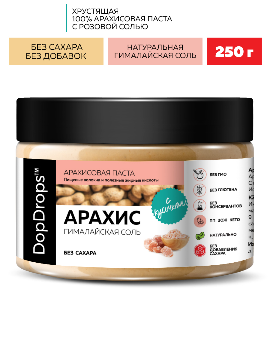 Арахисовая паста кранч с солью DopDrops — это натуральная ореховая паста без сахара, приготовленная из цельного арахиса премиум-сорта с добавлением гималайской розовой соли. Благодаря собственной технологии производства, арахис сохраняет все полезные свойства, витамины и микроэлементы. В составе только арахис и гималайская соль — никаких ГМО, глютена, лактозы, пальмового масла или искусственных добавок.