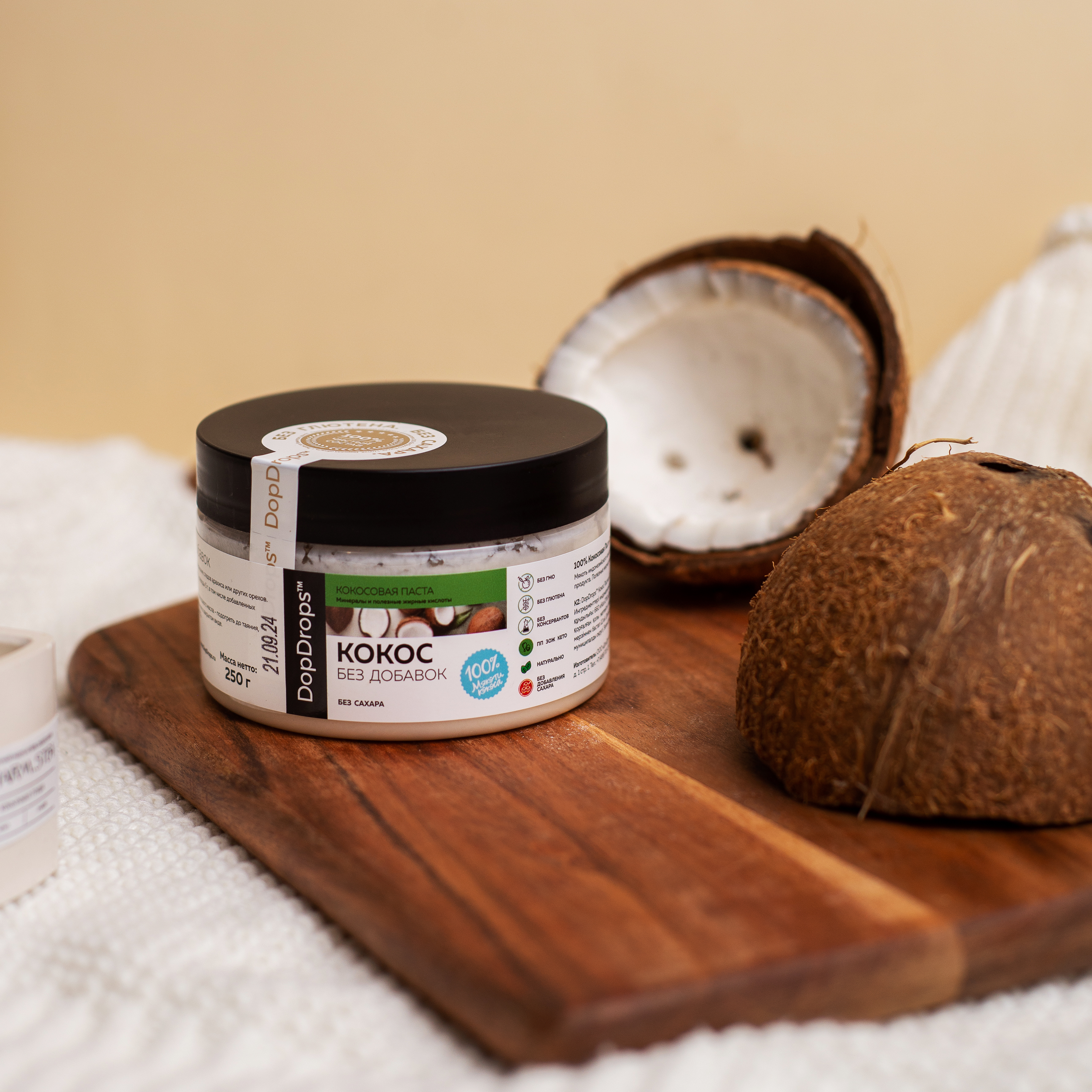 Кокосовая паста DopDrops - это 100% натуральный продукт без сахара с ярким вкусом и утонченным ароматом. Мякоть индонезийского кокоса смолота без нагрева в мягкий крем, чтобы вы получили максимум вкуса и пользы от этого изысканного десерта.