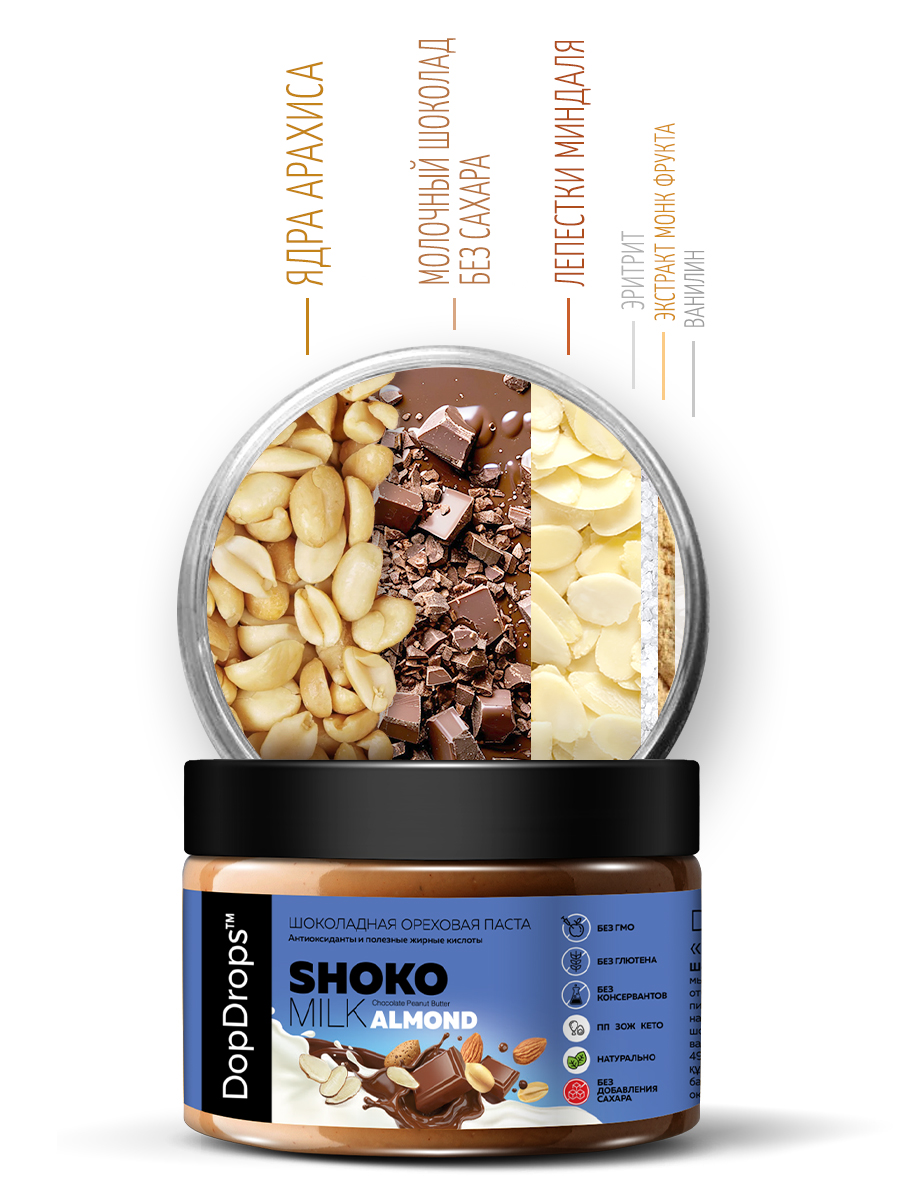 Побалуйте себя полезной сладостью — DopDrops Shoko Milk Almond. Это шоколадная паста без сахара с хрустящими лепестками миндаля, созданная по классической технологии производства шоколада. В составе только натуральные ингредиенты: молочный шоколад, арахис, миндаль, натуральные сахарозаменители. Эта ореховая паста — идеальный выбор для тех, кто придерживается правильного питания, кето или низкоуглеводной диеты.