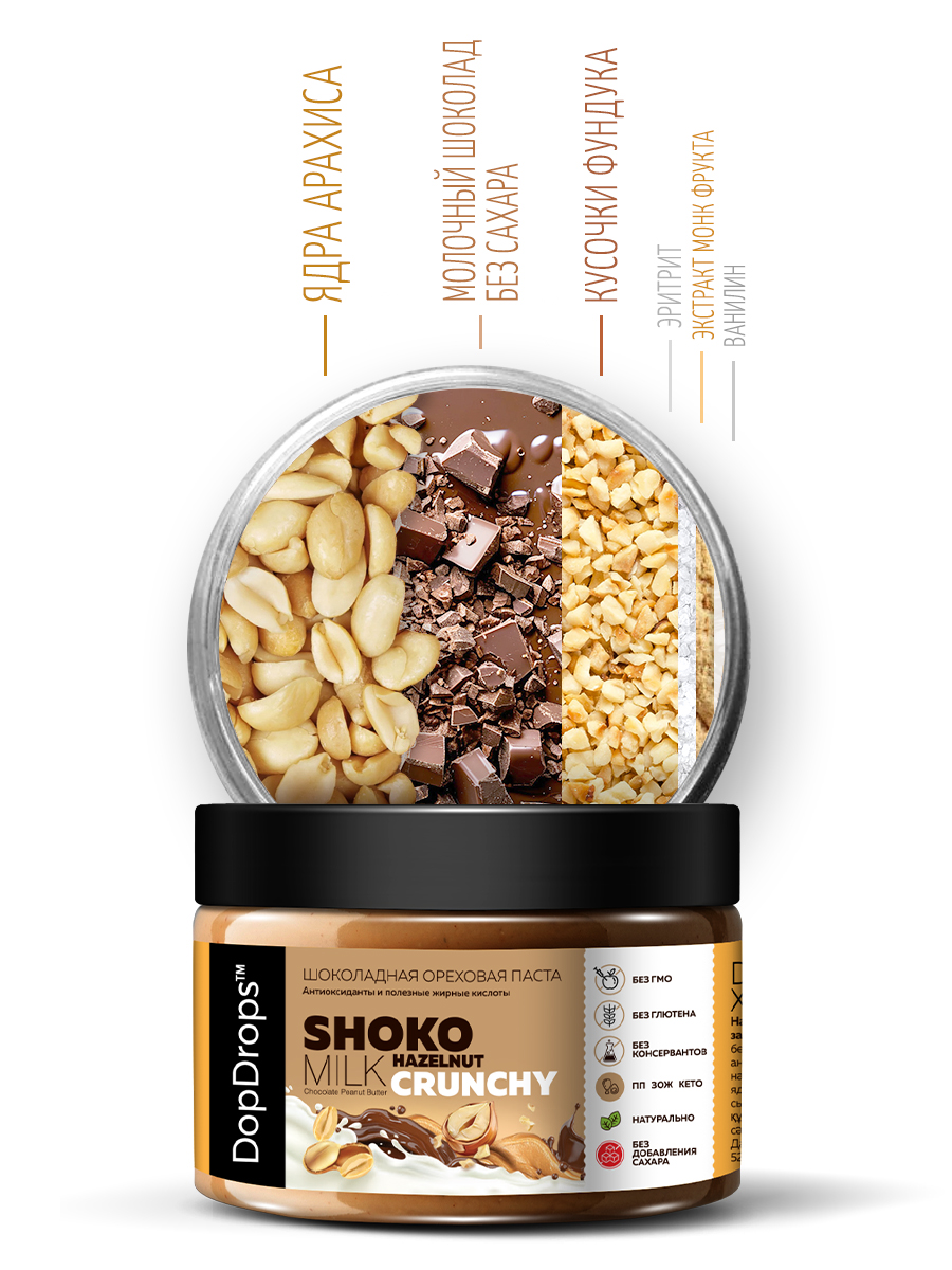Паста DopDrops Shoko Milk Peanut Hazelnut Crunchy – это шоколадное наслаждение, сочетающее в себе нежность арахисовой пасты и хрустящую текстуру кусочков фундука. Диетическая шоколадная арахисовая паста без сахара - отличный десерт и полезный продукт для всей семьи, который зарядит энергией на целый день.