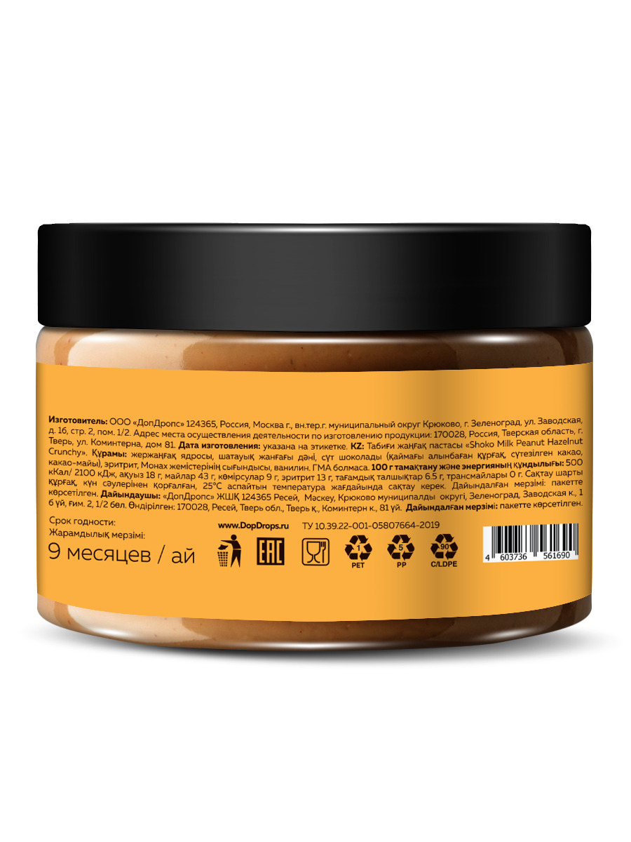 Никакого покупного шоколада - молочный шоколад производим сами! В составе цельное сухое молоко, натуральное масло какао, нерафинированное какао-масло первого отжима и тертое какао. Все шоколадные пасты DopDrops изготовлены по классической шоколадной технологии. Тщательно отобранные ингредиенты перетираются в каменной мельнице до нежнейшей консистенции. Этот длительный процесс занимает до 48 часов, что позволяет раскрыть естественный и чистый вкус шоколада и орехов без добавления какао-порошка. Микронизация - как у шоколада ручной работы.