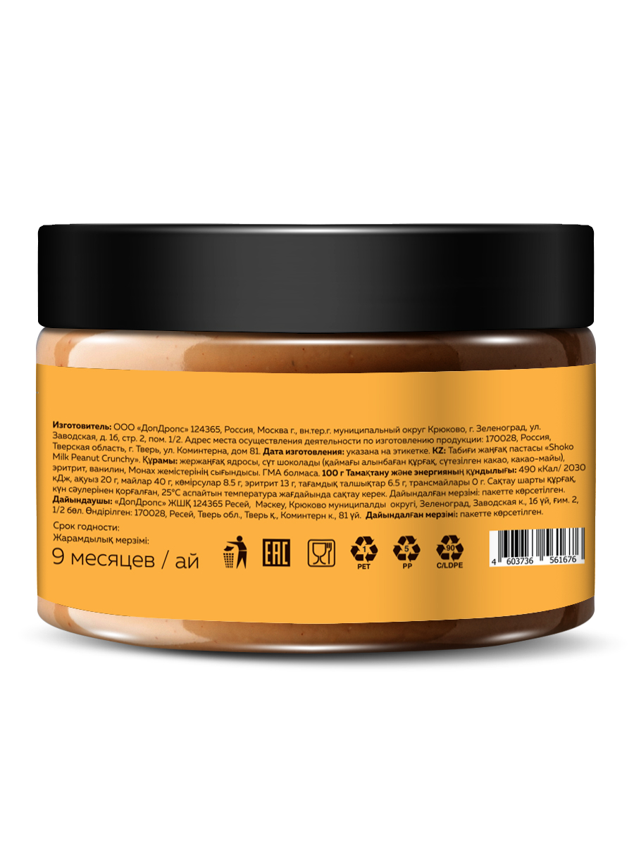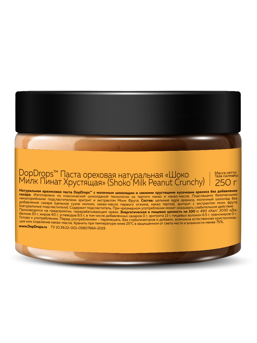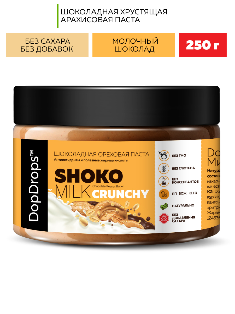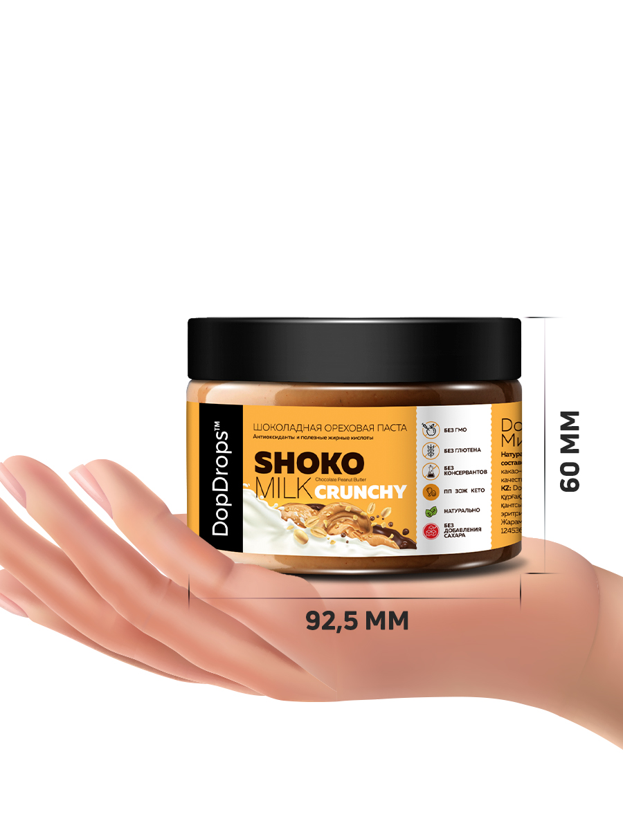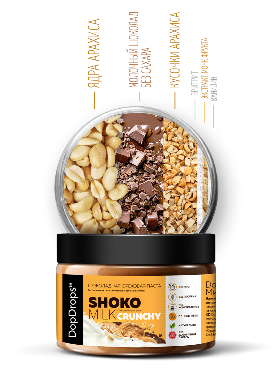 Шоколадные пасты DopDrops SHOKO MILK - это 100% натуральные низкоуглеводные пасты без сахара с высоким содержанием белка. Собственное производство полного цикла в Москве: термическая обработка ореха, помол и фасовка - все это делаем сами. Используем только цельный сортовой орех, специально отобранного премиум сорта. Тщательно контролируем качество на входе, запекаем в воздушной печи, без обжарки: так арахис сохраняет все свои полезные природные свойства.
