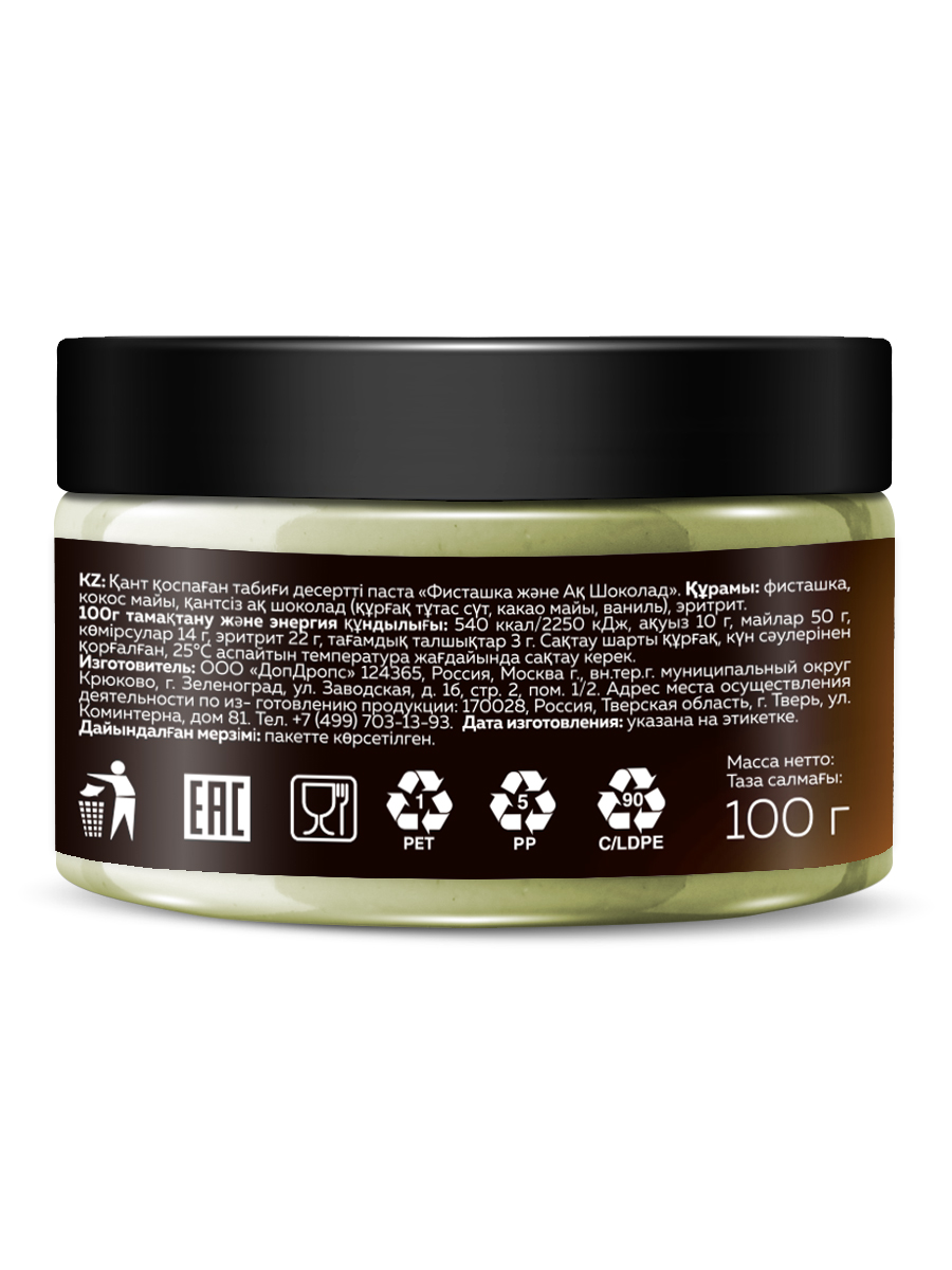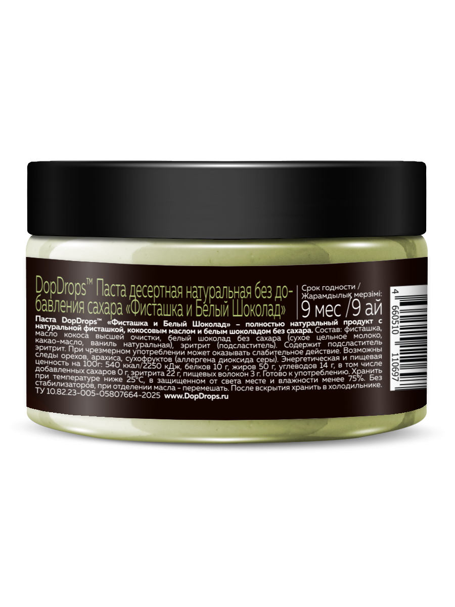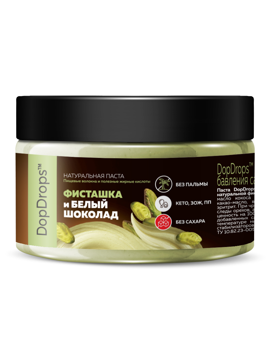 Фисташковая паста с белым шоколадом DopDrops – изысканных десерт с натуральным составом. Вдохновленные дубайским шоколадом, мы превратили легендарный десерт в полезную фисташково-шоколадную пасту, которая подходит для ежедневного употребления без вреда для здоровья. Благодаря уникальной технологии производства сохраняется натуральный ореховый аромат и насыщенность, характерные для восточных десертных паст.