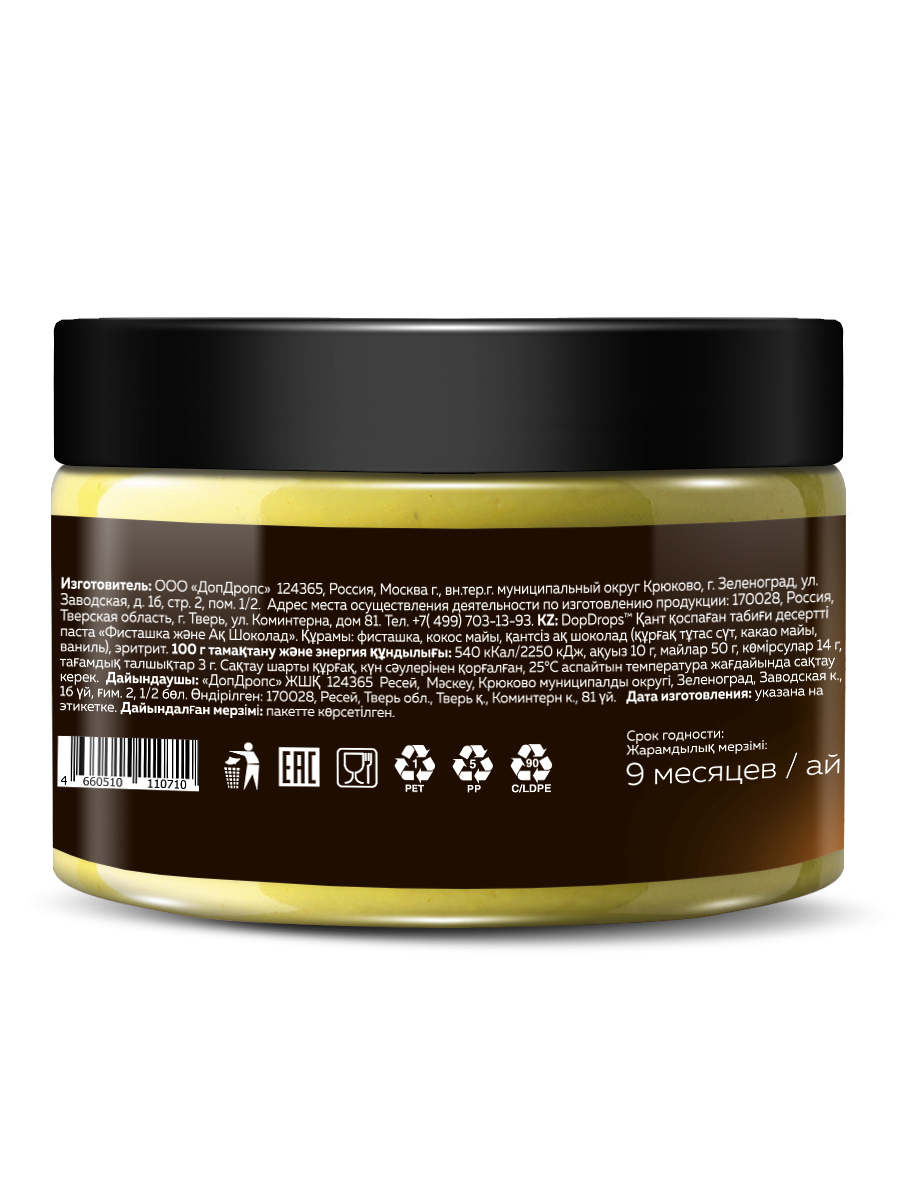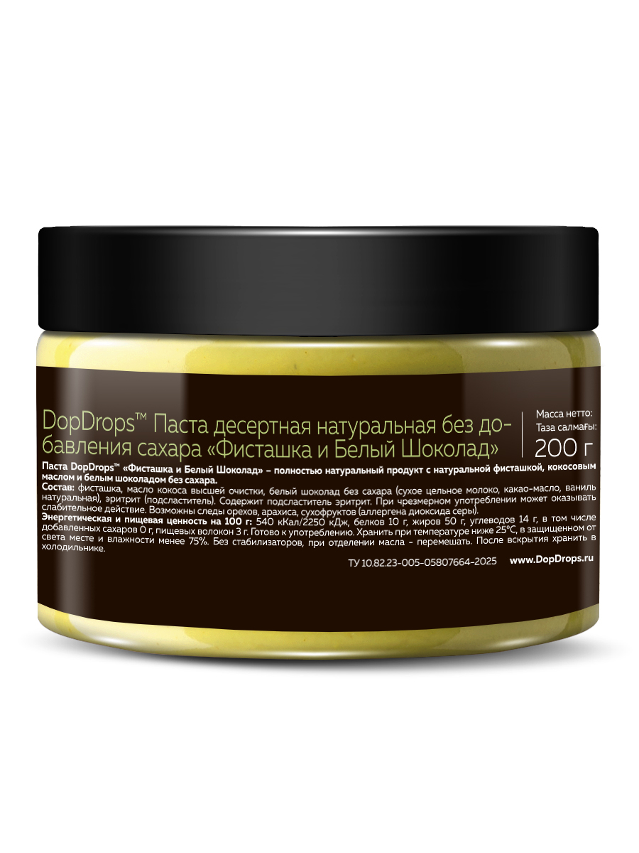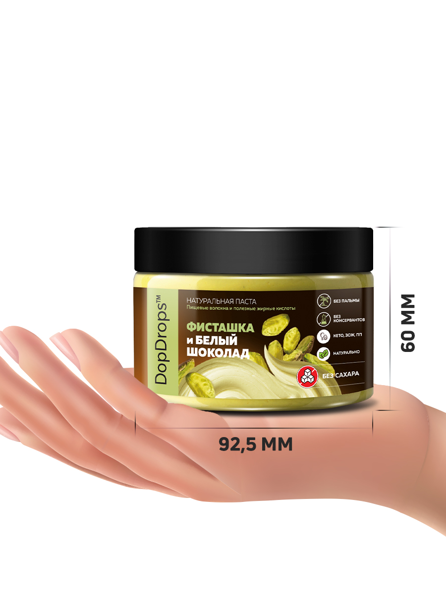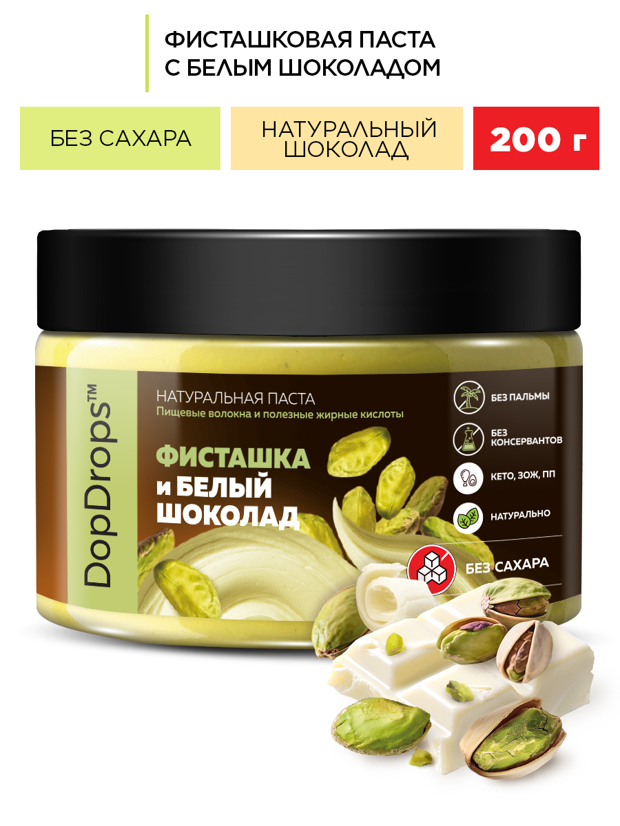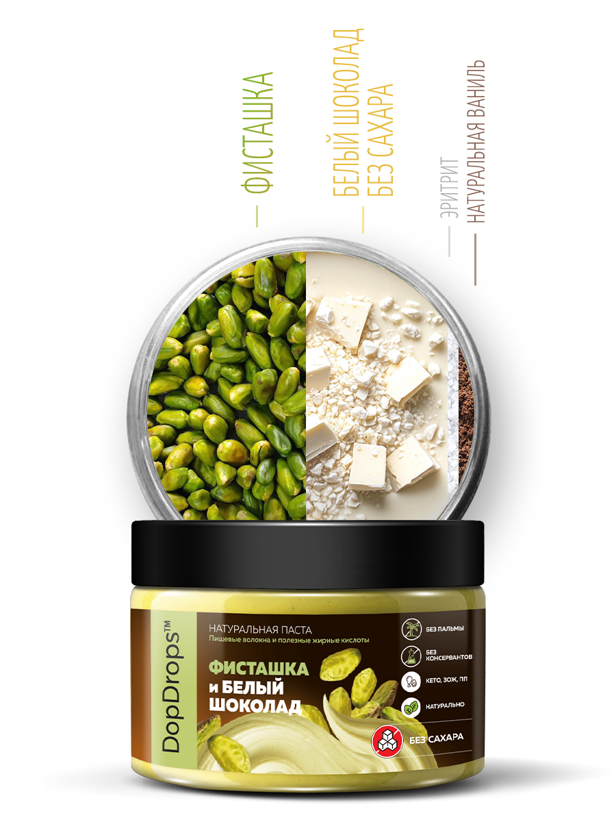 Фисташковая паста с белым шоколадом DopDrops – изысканных десерт с натуральным составом. Вдохновленные дубайским шоколадом, мы превратили легендарный десерт в полезную фисташково-шоколадную пасту, которая подходит для ежедневного употребления без вреда для здоровья. Благодаря уникальной технологии производства сохраняется натуральный ореховый аромат и насыщенность, характерные для восточных десертных паст.