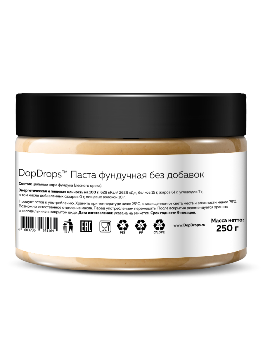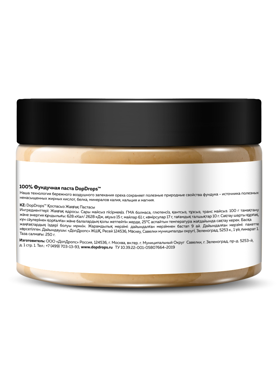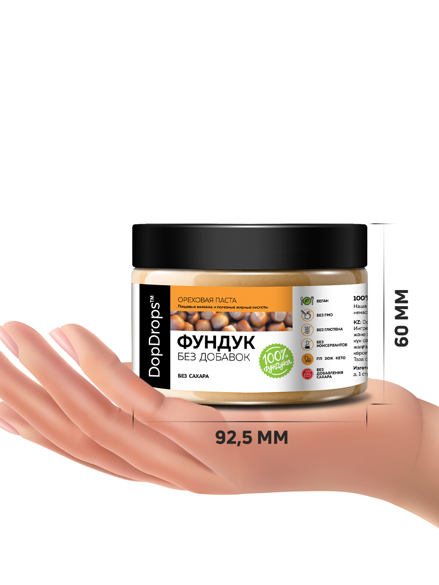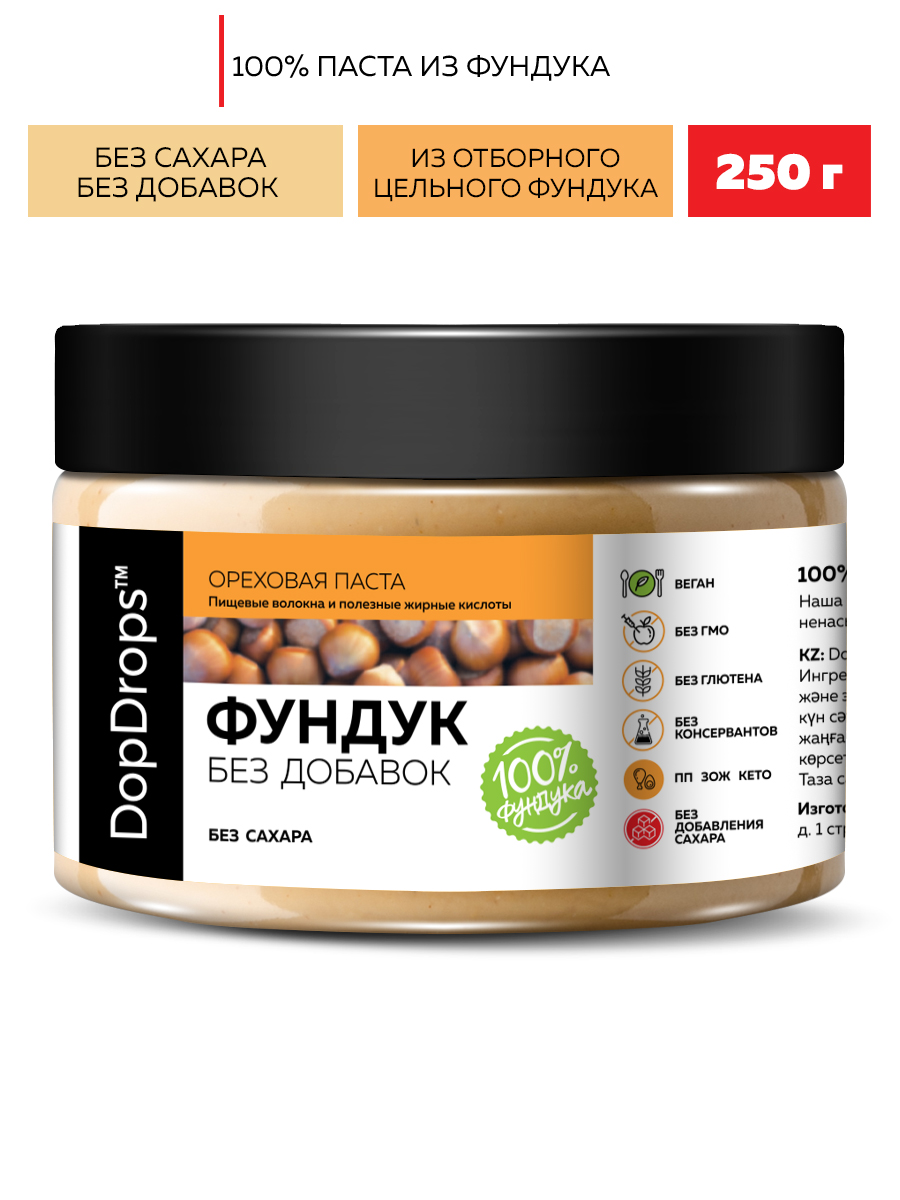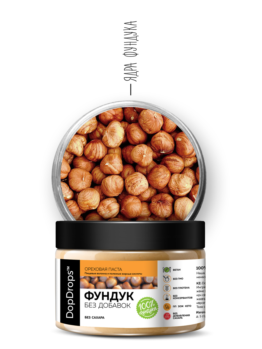 Фундучная паста DopDrops - это натуральная кето-паста без сахара из запеченных ядер фундука высочайшего качества с насыщенным вкусом лесного ореха. Любимый многими лесной орех или фундук — настоящий кладезь растительного белка, пищевых волокон и полезных жирных кислот. Также в этих орехах много омега-3 и омега-6, витаминов, минералов и антиоксидантов.