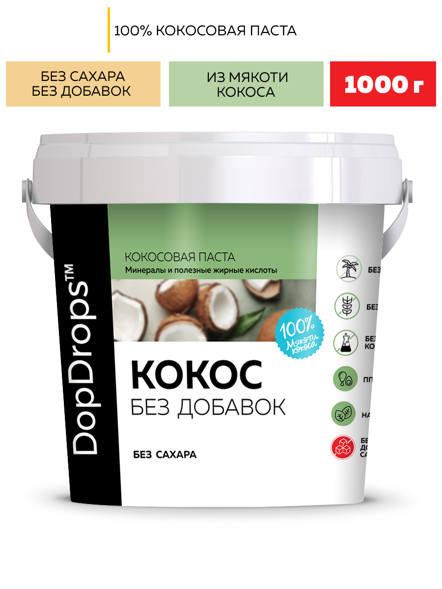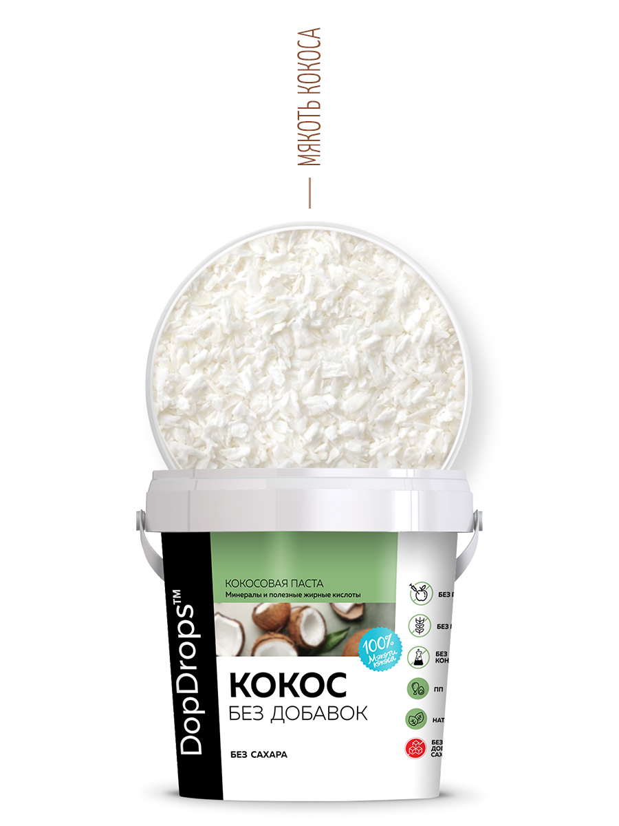 Кокосовая паста DopDrops - это 100% натуральный продукт без сахара с ярким вкусом и утонченным ароматом. Мякоть индонезийского кокоса смолота без нагрева в мягкий крем, чтобы вы получили максимум вкуса и пользы от этого изысканного десерта.