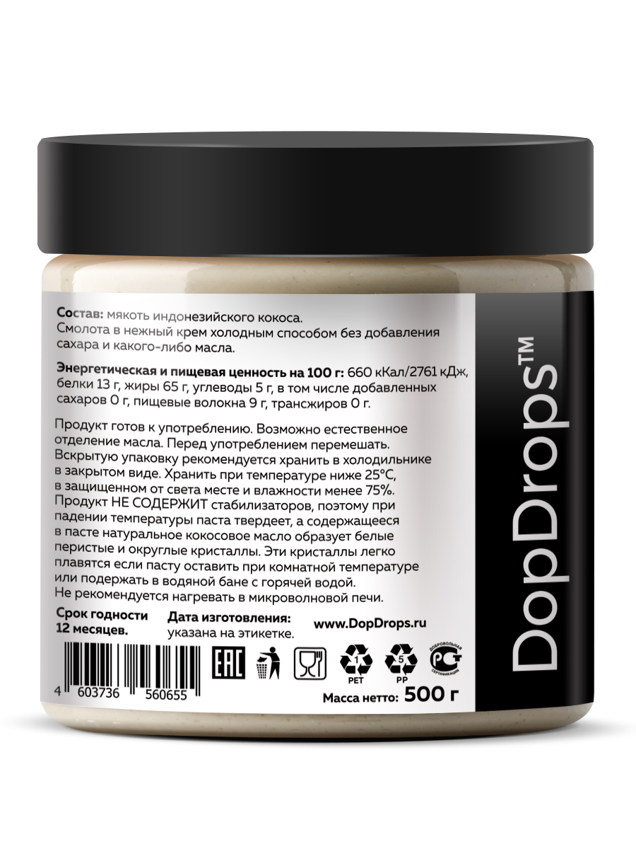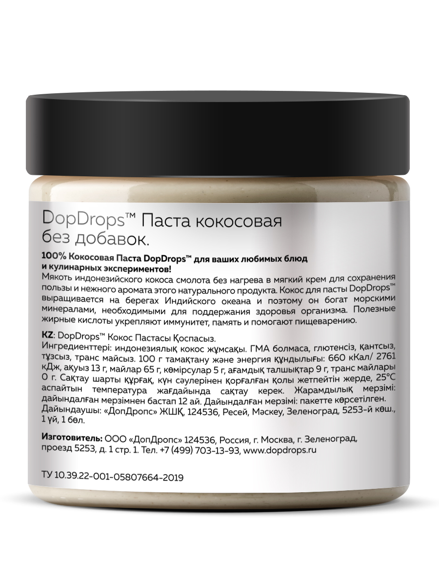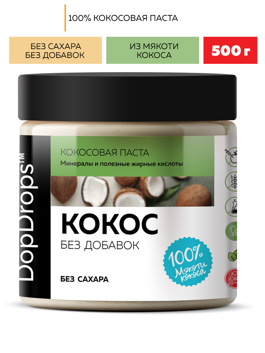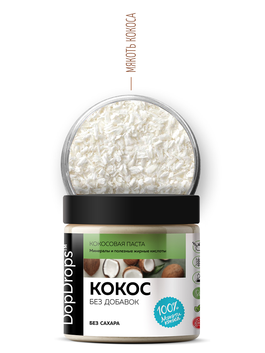 Кокосовая паста DopDrops - это 100% натуральный продукт без сахара с ярким вкусом и утонченным ароматом. Мякоть индонезийского кокоса смолота без нагрева в мягкий крем, чтобы вы получили максимум вкуса и пользы от этого изысканного десерта.