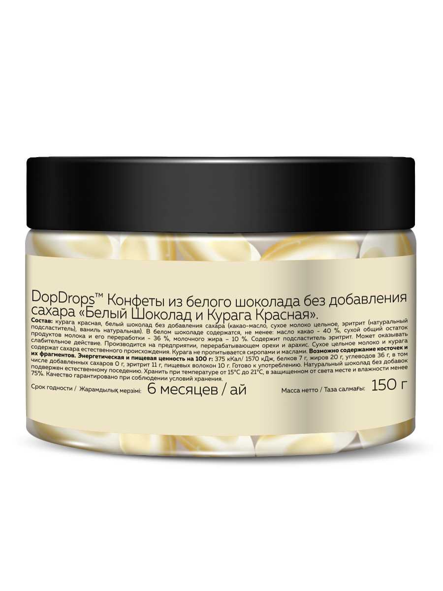 Шоколадные конфеты без сахара от допдропс изготавливаются на собственном производстве по классической технологии. Глазурь при изготовлении пп конфет не используется, это именно белый шоколад без сахара. Микронизация как у шоколада ручной работы. Курага сушеная — это натуральный абрикос, который получается путем высушивания свежих фруктов. Для максимальной пользы мы используем красную курагу специально отобранного премиум сорта. Это настоящее двойное удовольствие, когда вкус фрукта, который был бережно высушен и сохранил полезные вещества, смешивается с нотами шоколада, создавая абсолютно новое сочетание.