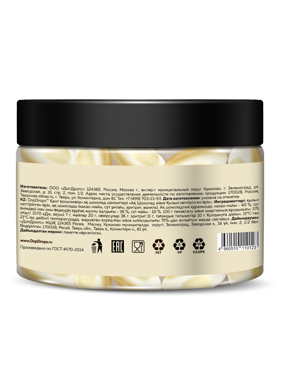 В качестве подсластителя используем натуральный сахарозаменитель эритритол. Эритрит имеет нулевую калорийность, не поднимает уровень сахара в крови и абсолютно безопасен. Сухое цельное молоко и курага содержат сахара естественного происхождения. Курага не пропитывается сиропами и маслами. Только натуральный шоколад собственного производства и цельные, сортовые фрукты для продуктов DopDrops!