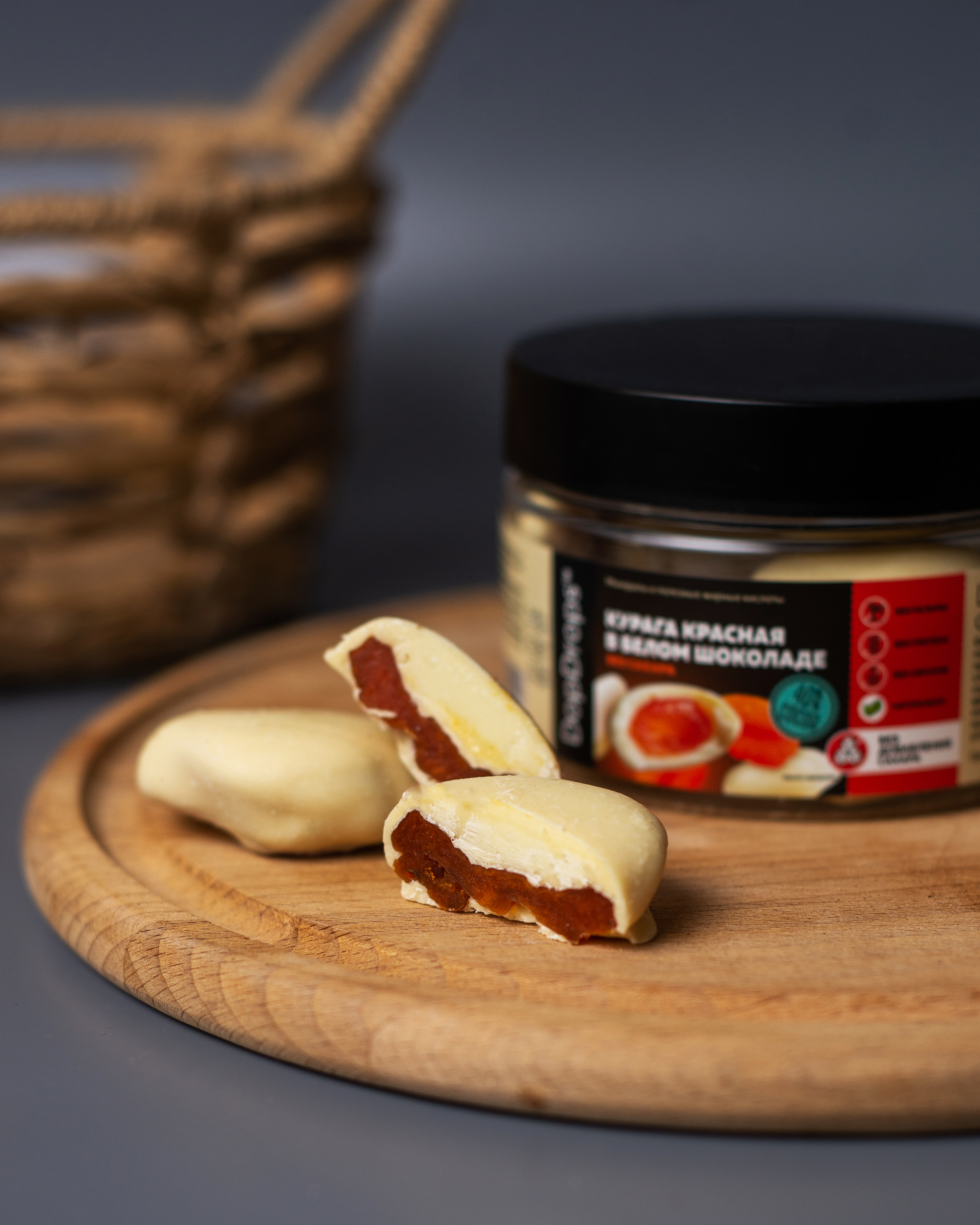 Натуральные сладости курага в белом шоколаде в красивой и удобной упаковке станет достойным подарком на любой праздник и по любому торжественному случаю. Сладкий подарок для ваших близких и людей любого возраста, которым можно наслаждаться в любое время дня. Попробуйте абрикосовые конфеты из красной кураги как альтернативу вредным сладостям.