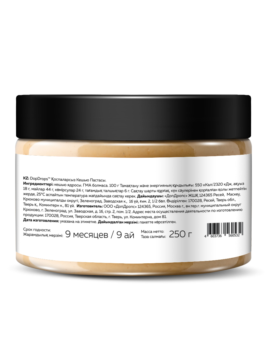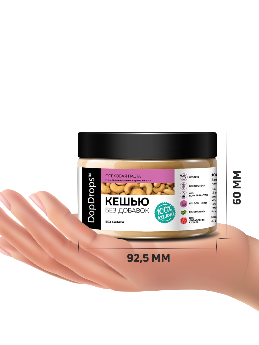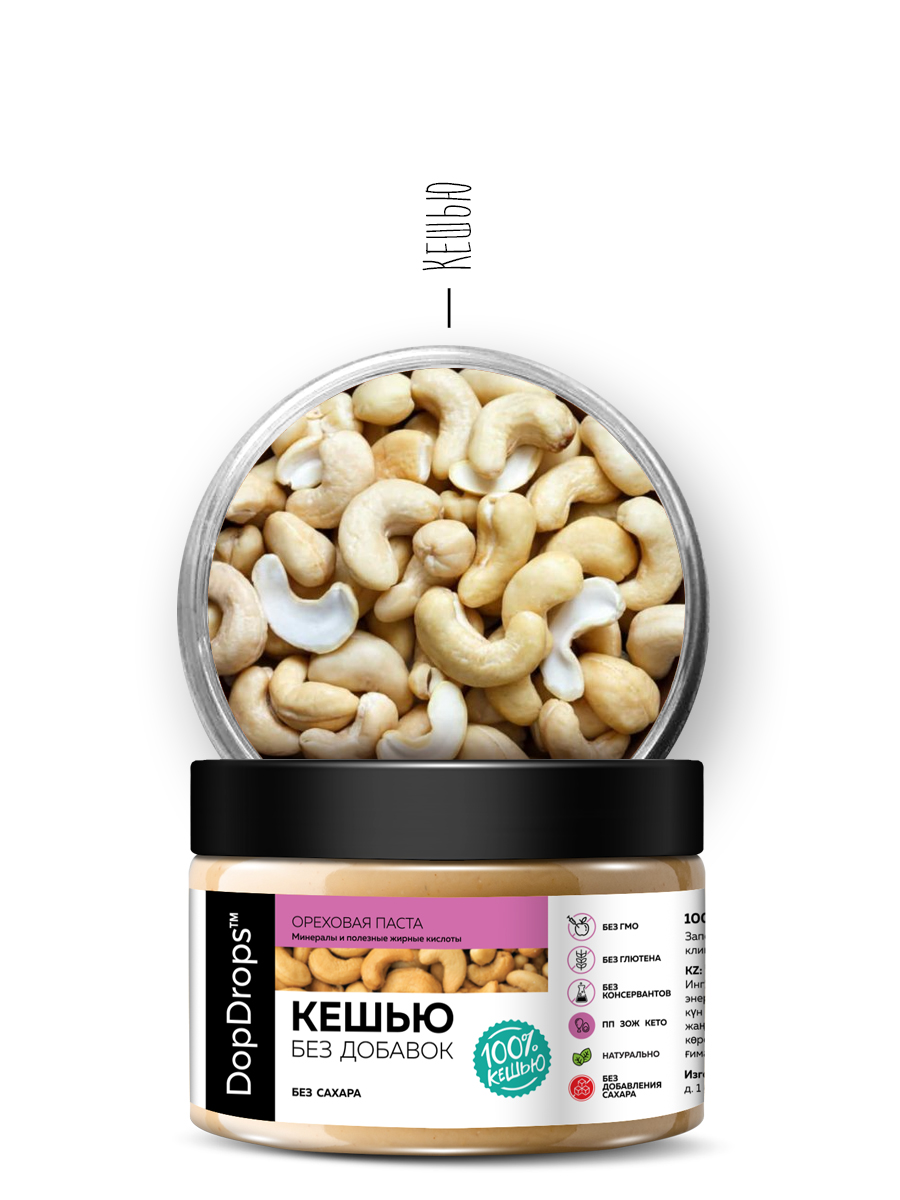 Ореховая паста DopDrops Кешью - это нежнейшая крем-паста из запеченных ядер кешью высочайшего качества, собранных в Юго-Восточной Азии. Диетический продукт без сахара, без глютена, без лактозы, без консервантов, который отличается уникальным сочетанием вкуса и пользы.