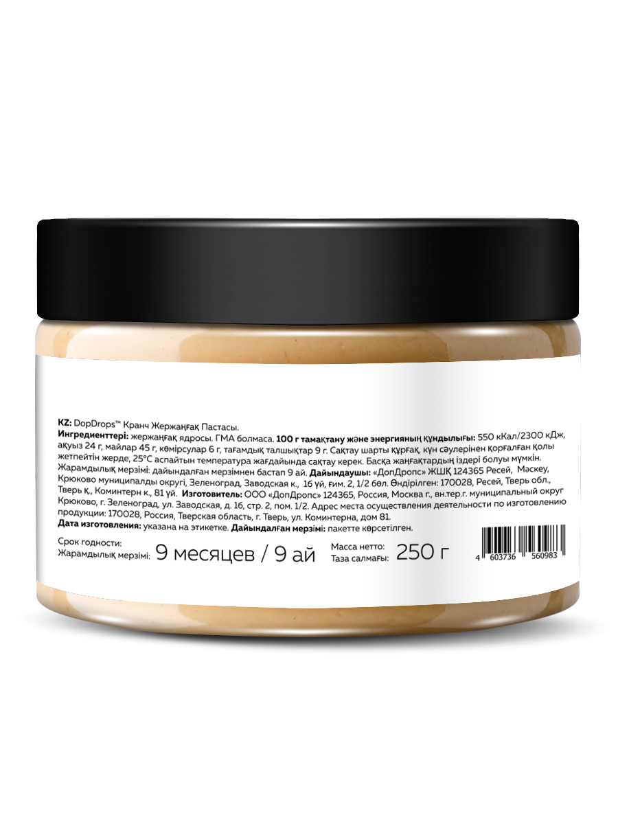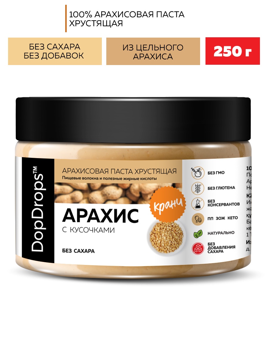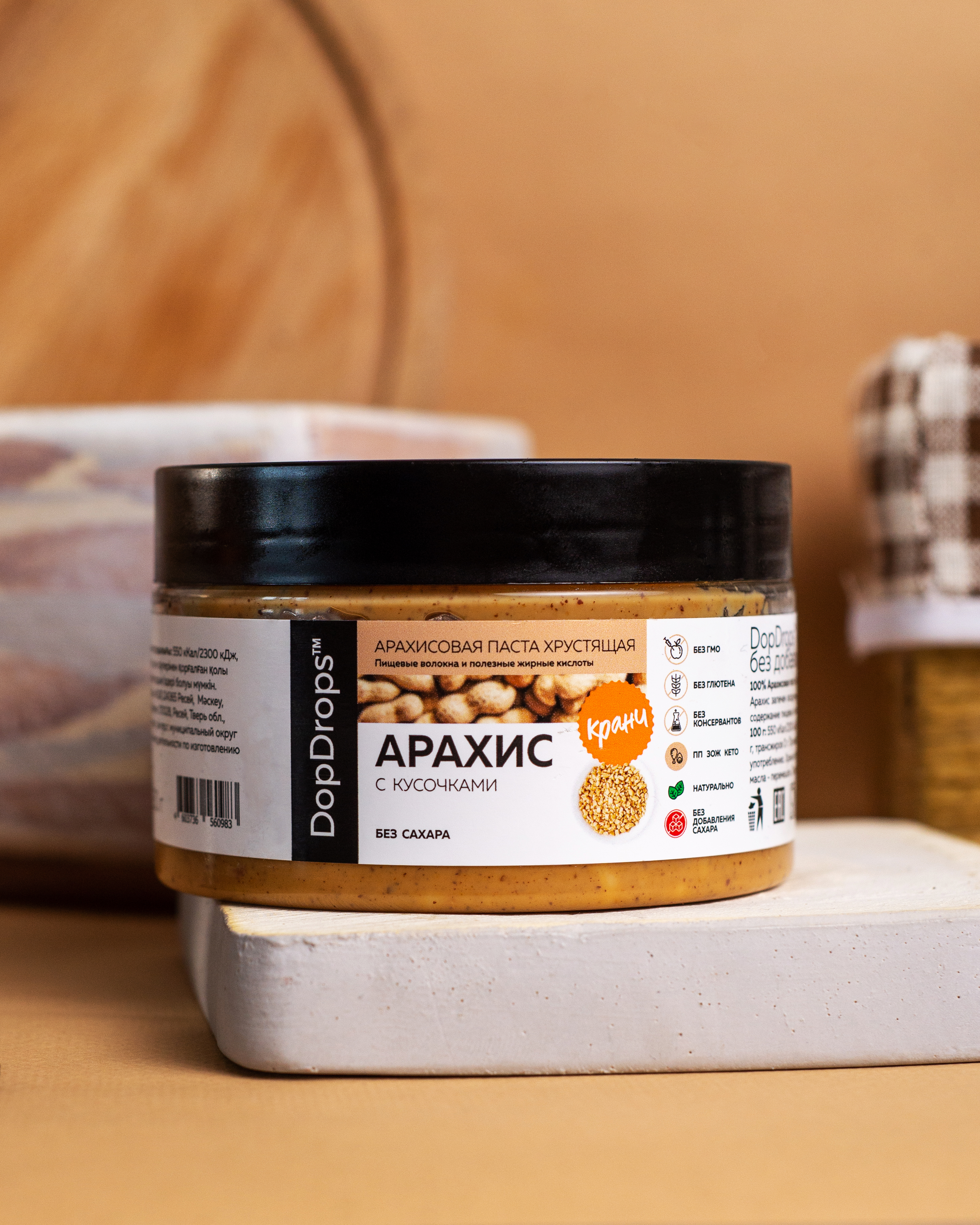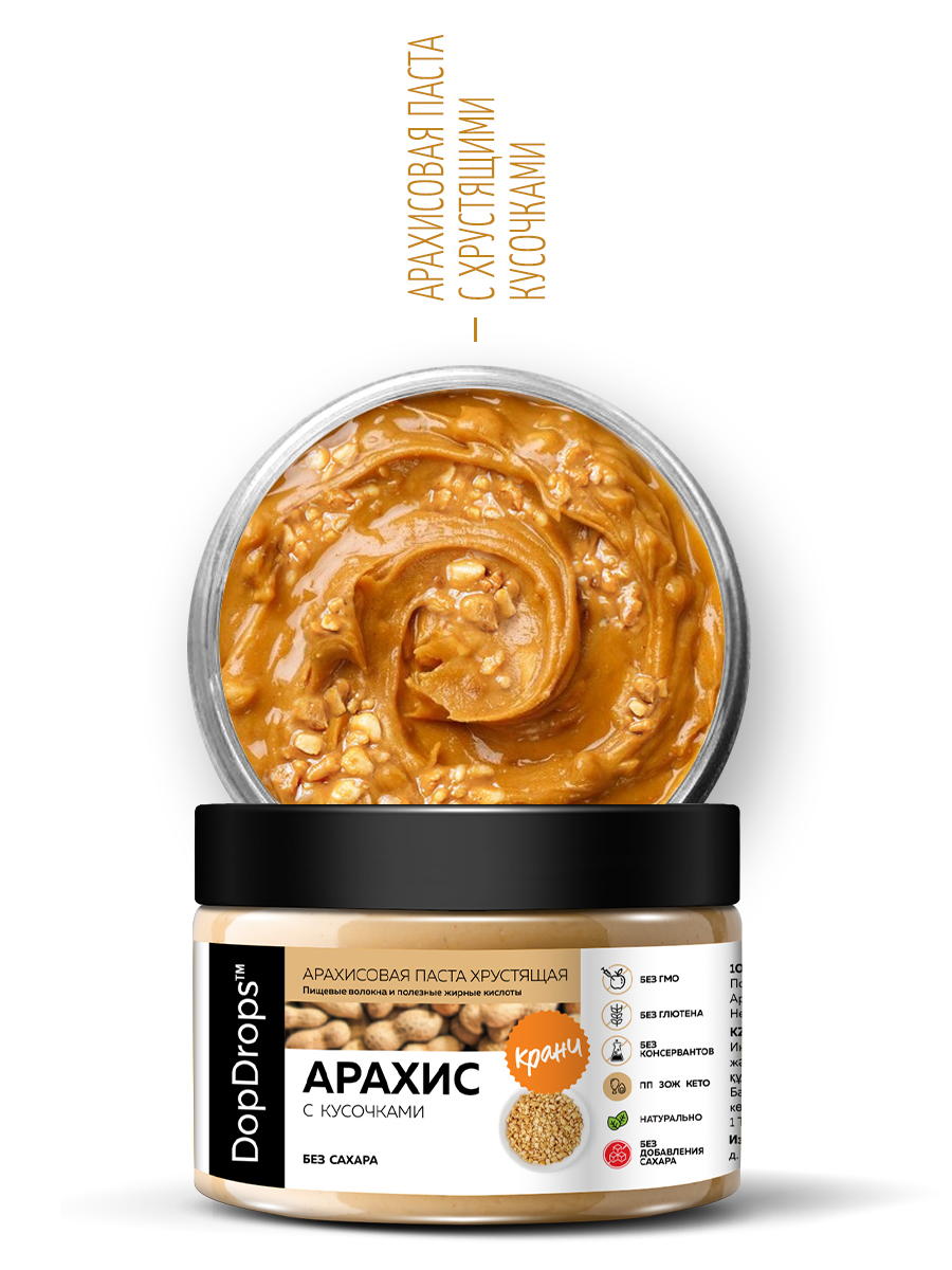 Арахисовая паста с хрустящими кусочками DopDrops – это не только вкусный, но и полезный продукт с огромным количеством витаминов и необходимых микроэлементов. Паста кранч из арахиса без сахара станет незаменимым дополнением к вашему правильному питанию, а также прекрасным угощением для всей семьи.