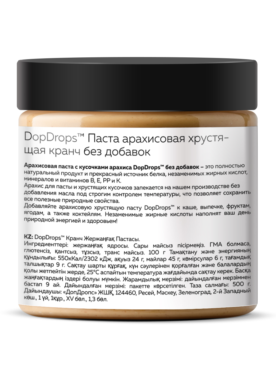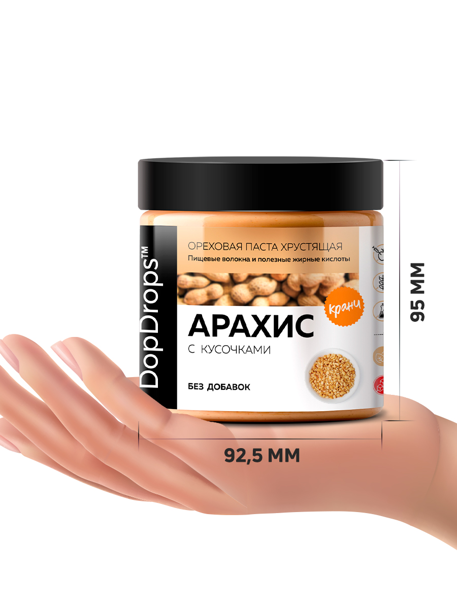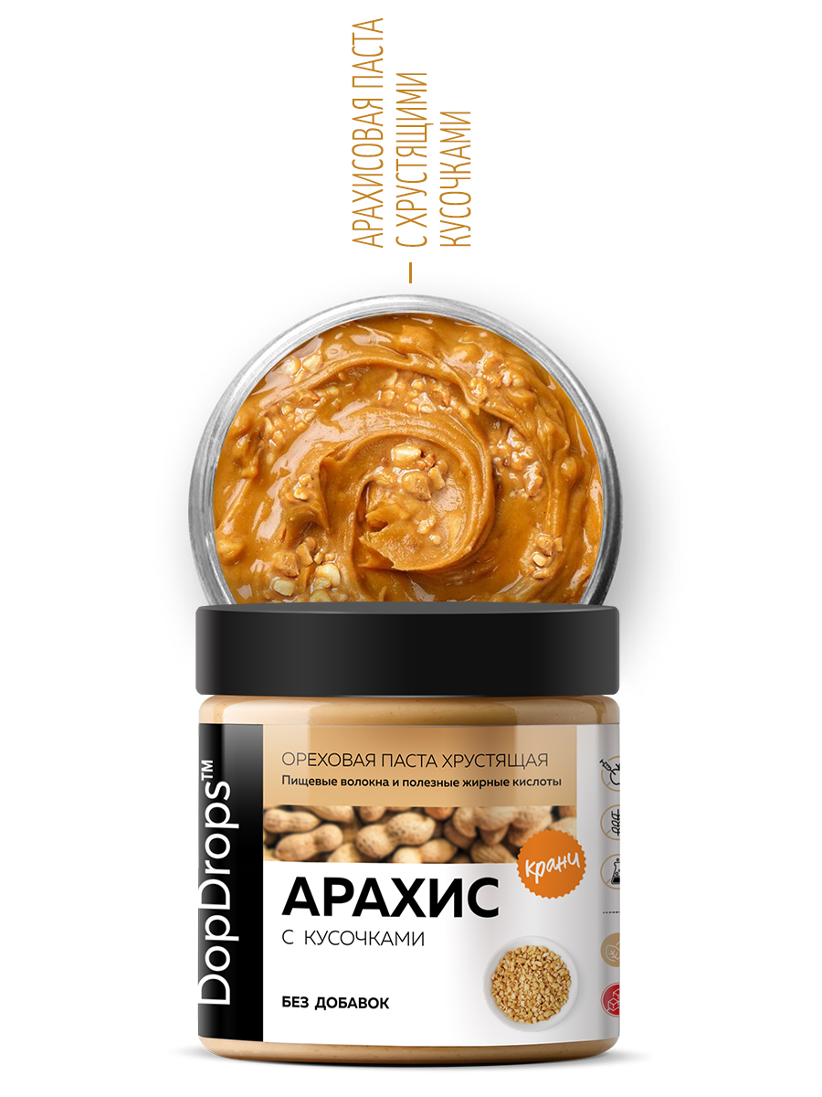 Арахисовая паста с хрустящими кусочками DopDrops – это не только вкусный, но и полезный продукт с огромным количеством витаминов и необходимых микроэлементов. Паста кранч из арахиса без сахара станет незаменимым дополнением к вашему правильному питанию, а также прекрасным угощением для всей семьи.