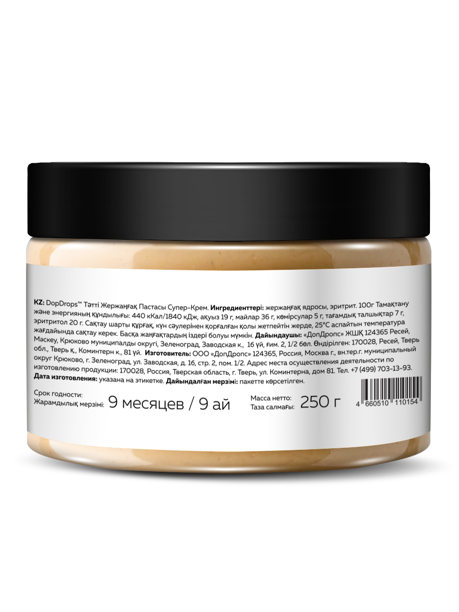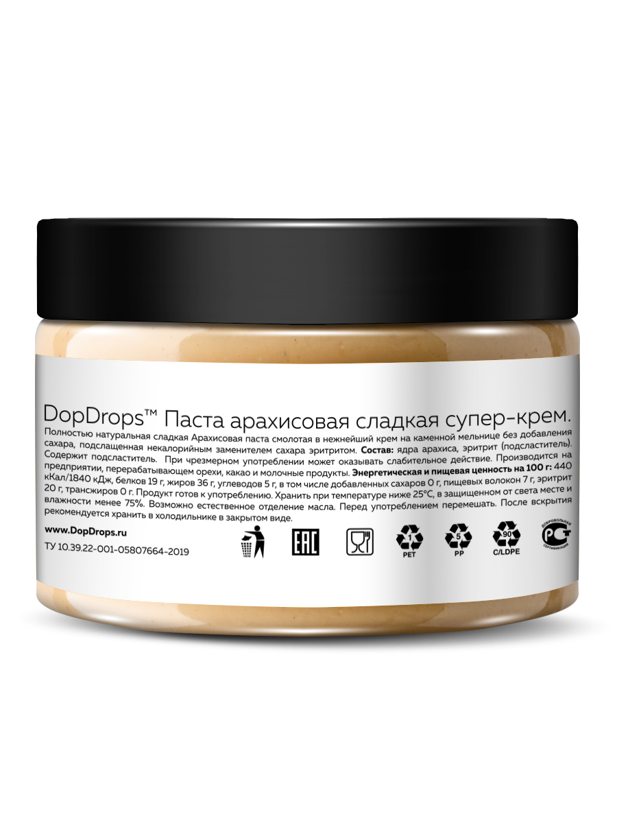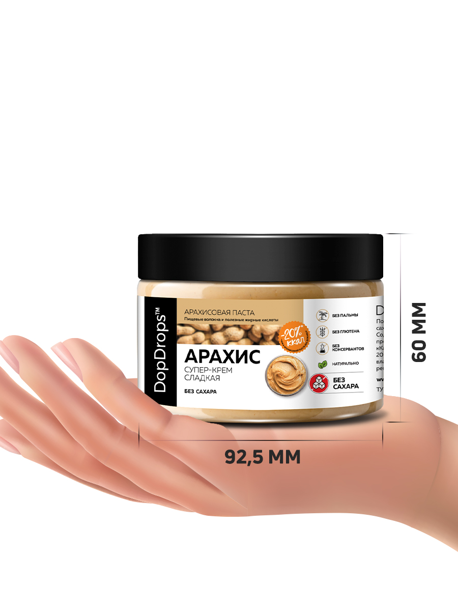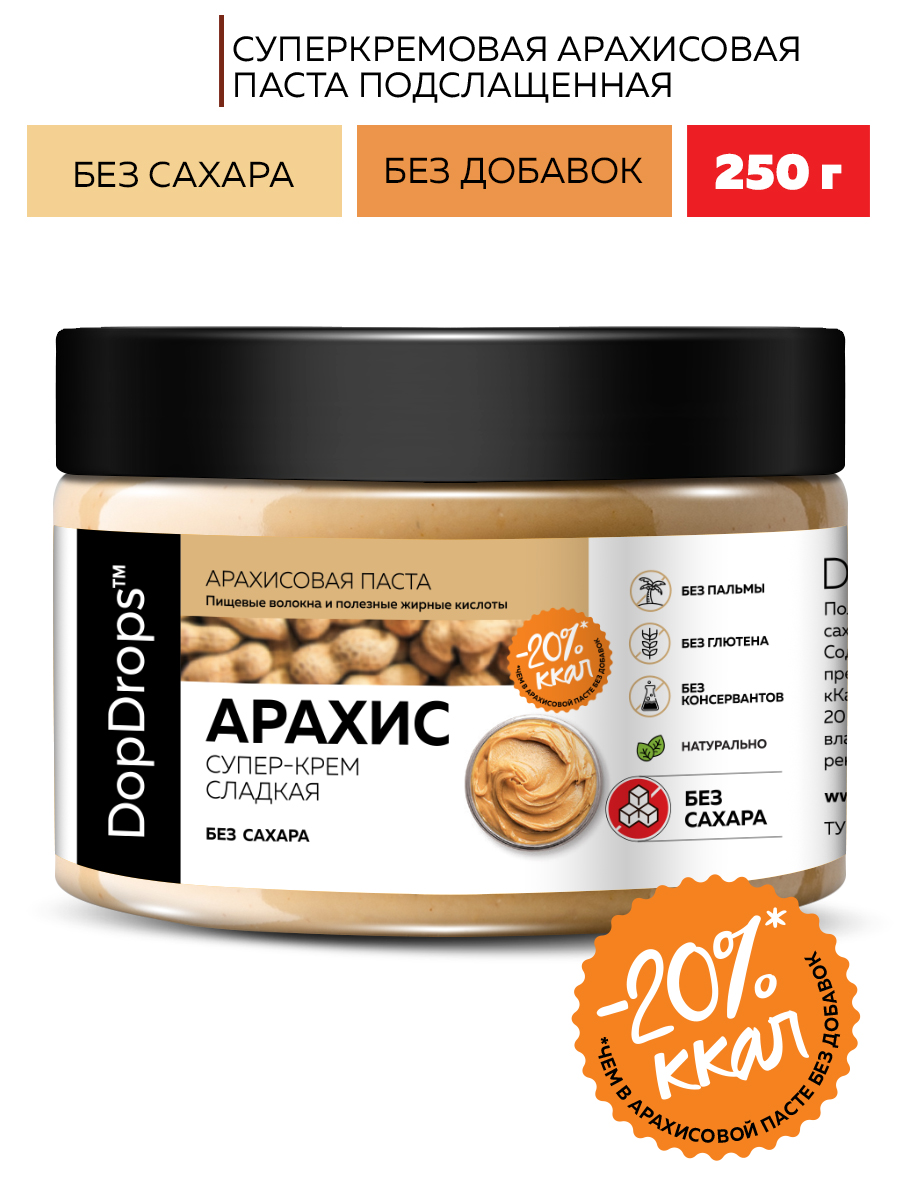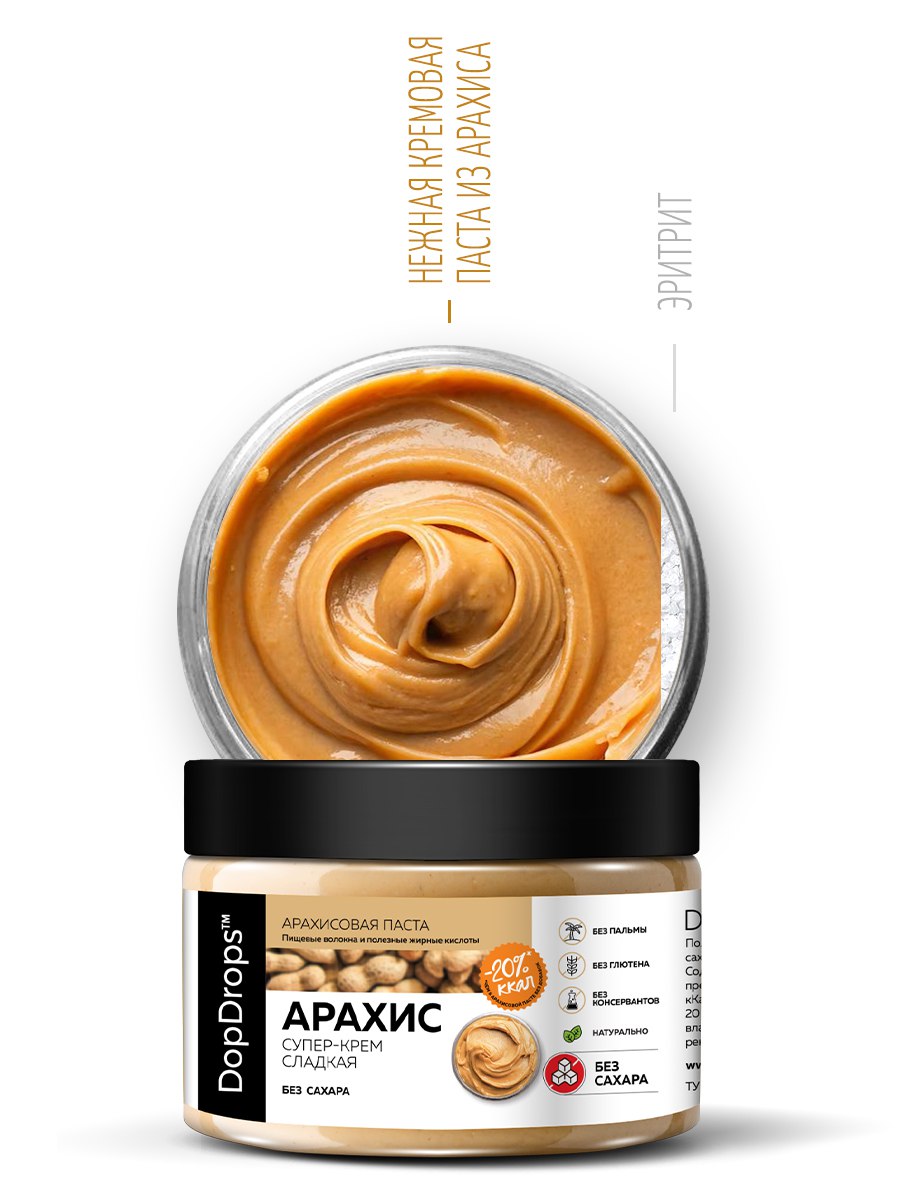 Арахисовая паста супер крем сладкая от DopDrops – это не только вкусный, но и полезный продукт с огромным количеством витаминов и необходимых микроэлементов. Сладкая, но без сахара, уникальная по своим свойствам. В этой пасте сочетается легкая естественная и приятная сладость и нежная кремовая текстура перемолотого арахиса. Паста из арахиса без сахара станет незаменимым дополнением к вашему правильному питанию, а также прекрасным угощением для всей семьи.