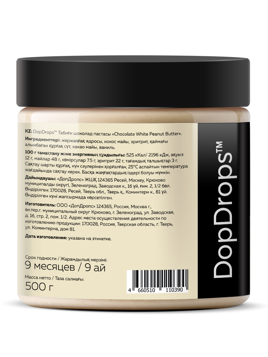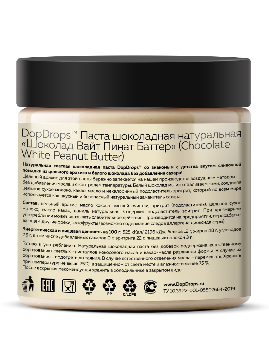 Натуральная светлая ореховая паста DopDrops из цельного арахиса и белого шоколада — это лакомство для всей семьи. Продукт отличается насыщенным вкусом, кремовой консистенцией и натуральным составом. Сочетание арахиса и белого шоколада подарит невероятное удовольствие и зарядит энергией на весь день.