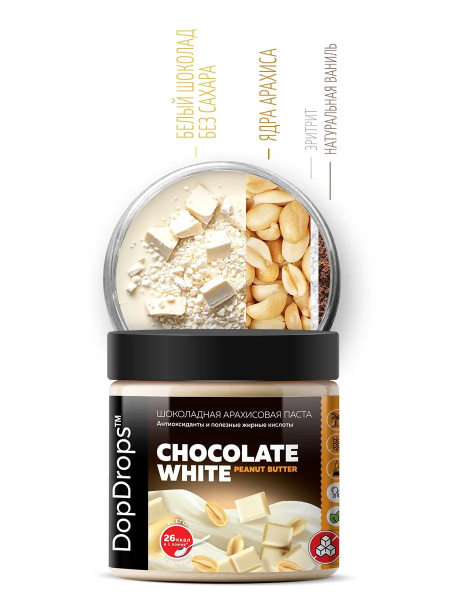 Шоколадная паста с арахисом и белым шоколадом — это натуральное лакомство, которое станет замечательным сладким подарком для ваших близких и людей любого возраста. Пасты ДопДропс – вкусные и натуральные продукты без сахара и глютена для тех, кто ценит качество и следит за своим здоровьем.