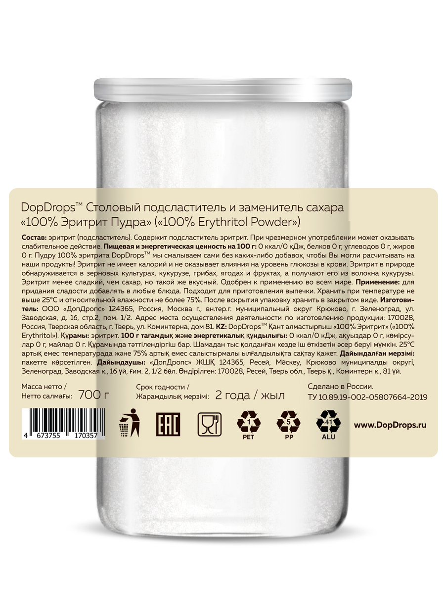 Эритрит пудра DopDrops — это современный натуральный подсластитель и сахарозаменитель для правильного питания, кето-диеты и диабетиков. В составе — только эритритол, без добавок и ГМО. Эритритол заменитель сахара безопасен, не содержит калорий, углеводов, глютена и лактозы.