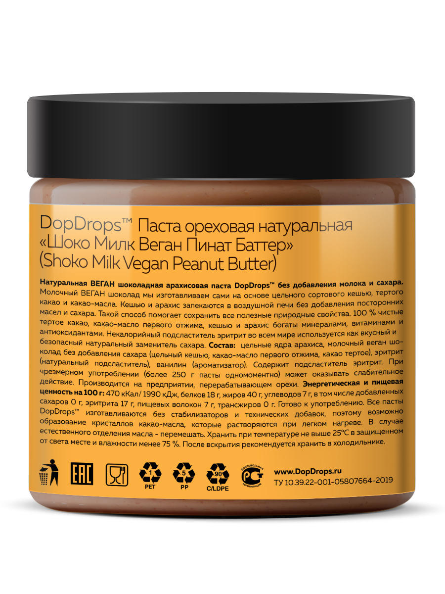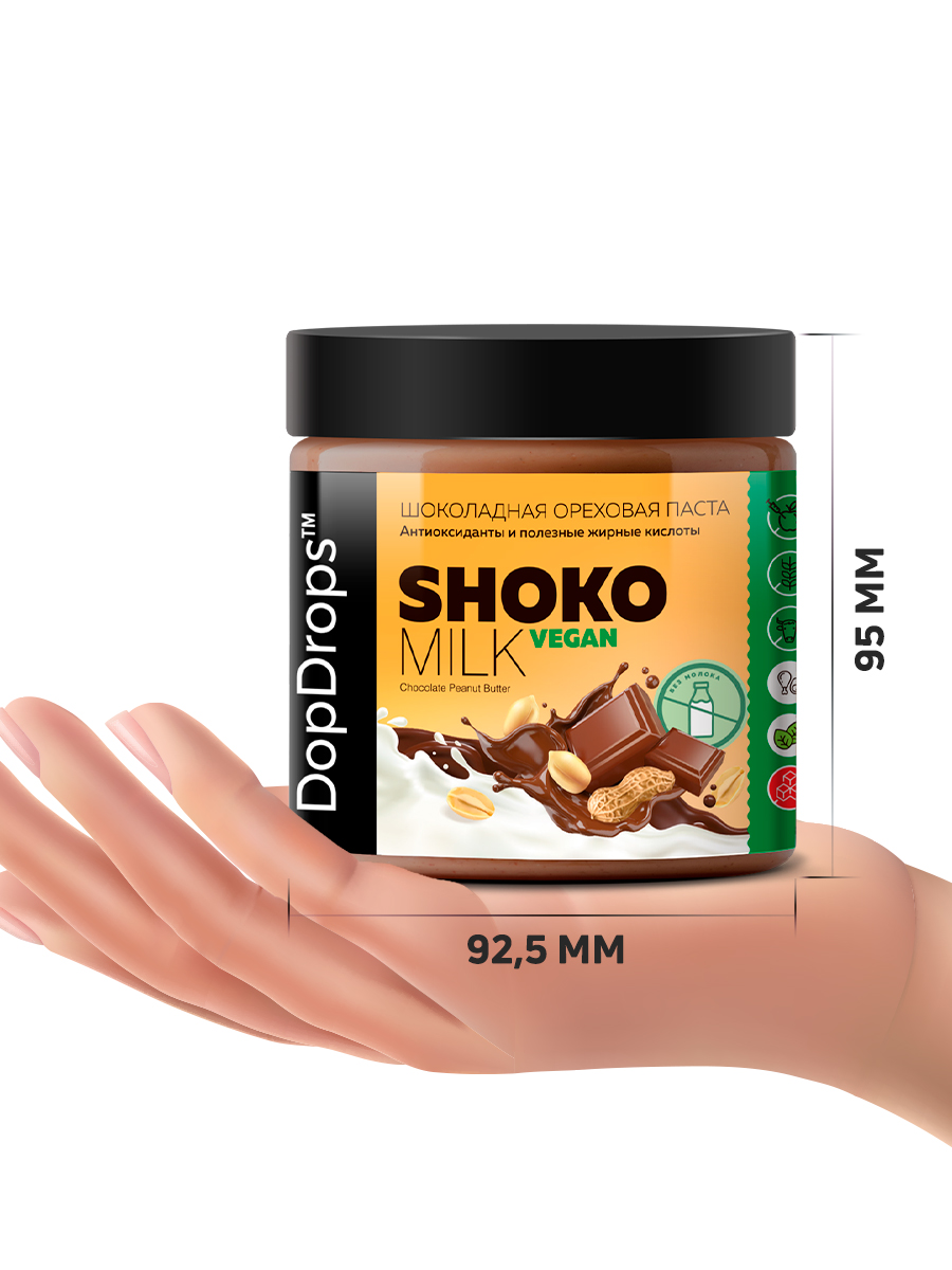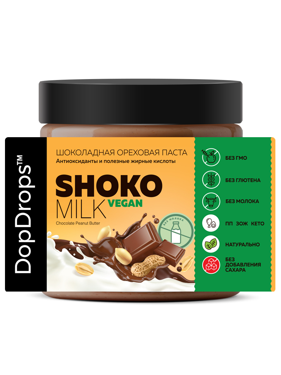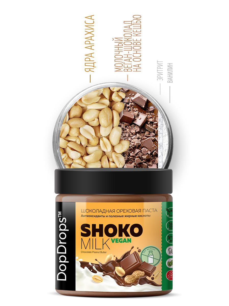 Шоколадная паста DopDrops Shoko Milk Vegan Peanut Butter без молока украсит ваш завтрак и полезный перекус, вдохновит на создание новых блюд правильного и здорового питания. Прекрасный баланс между арахисом и кешью в сочетании с ярким вкусом молочного шоколада без добавления сахара создают уникальный насыщенный вкус, который не оставит вас равнодушными.