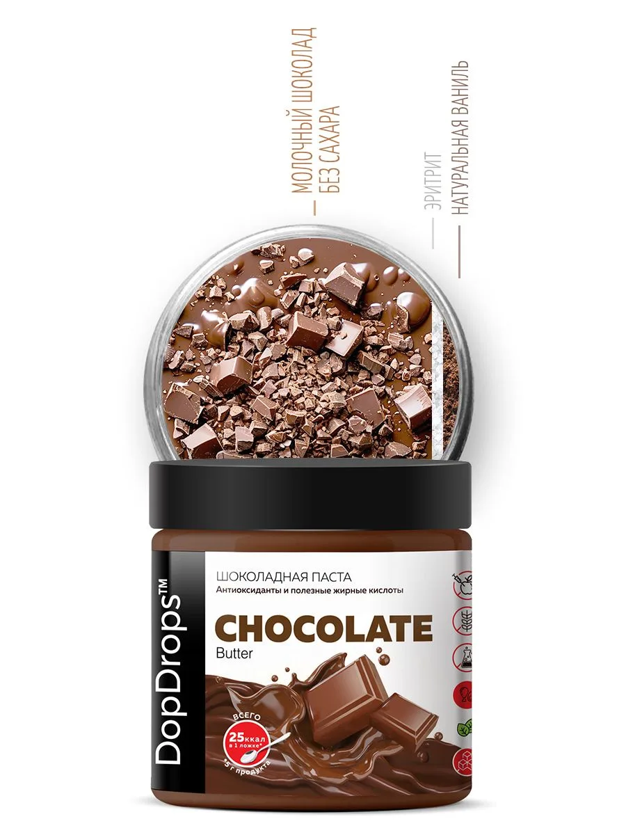 Откройте для себя настоящую роскошь вкуса — шоколадная паста без сахара DopDrops Chocolate Butter! Это натуральная шоколадная паста с высоким содержанием молочного шоколада, созданная для кето, правильного питания (ПП), диабетиков, спортсменов и всех, кто ценит качество и заботится о здоровье.