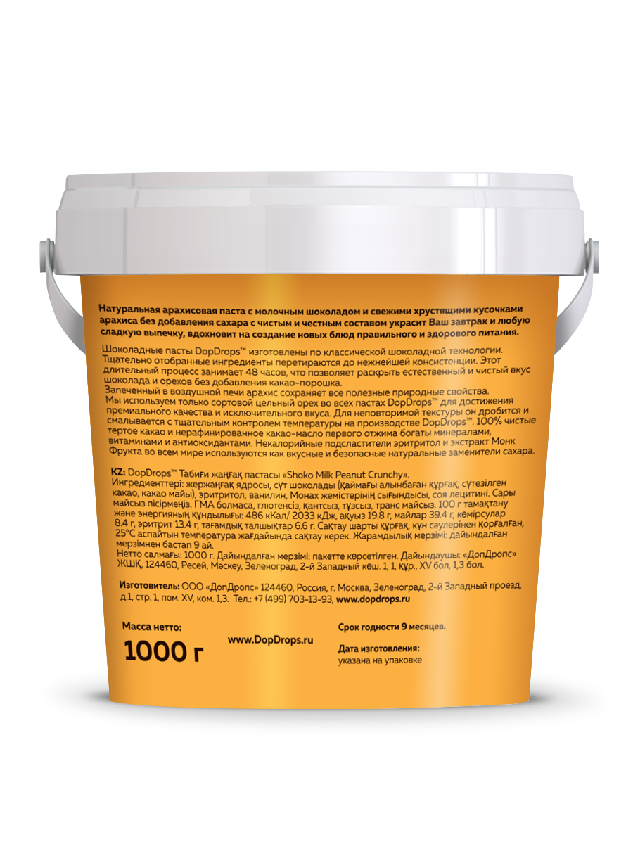Шоколадные пасты DopDrops SHOKO MILK - это 100% натуральные низкоуглеводные пасты без сахара с высоким содержанием белка. Собственное производство полного цикла: термическая обработка ореха, помол и фасовка - все это делаем сами. Используем только цельный сортовой орех, специально отобранного премиум сорта. Тщательно контролируем качество на входе, запекаем в воздушной печи, без обжарки: так арахис сохраняет все свои полезные природные свойства.