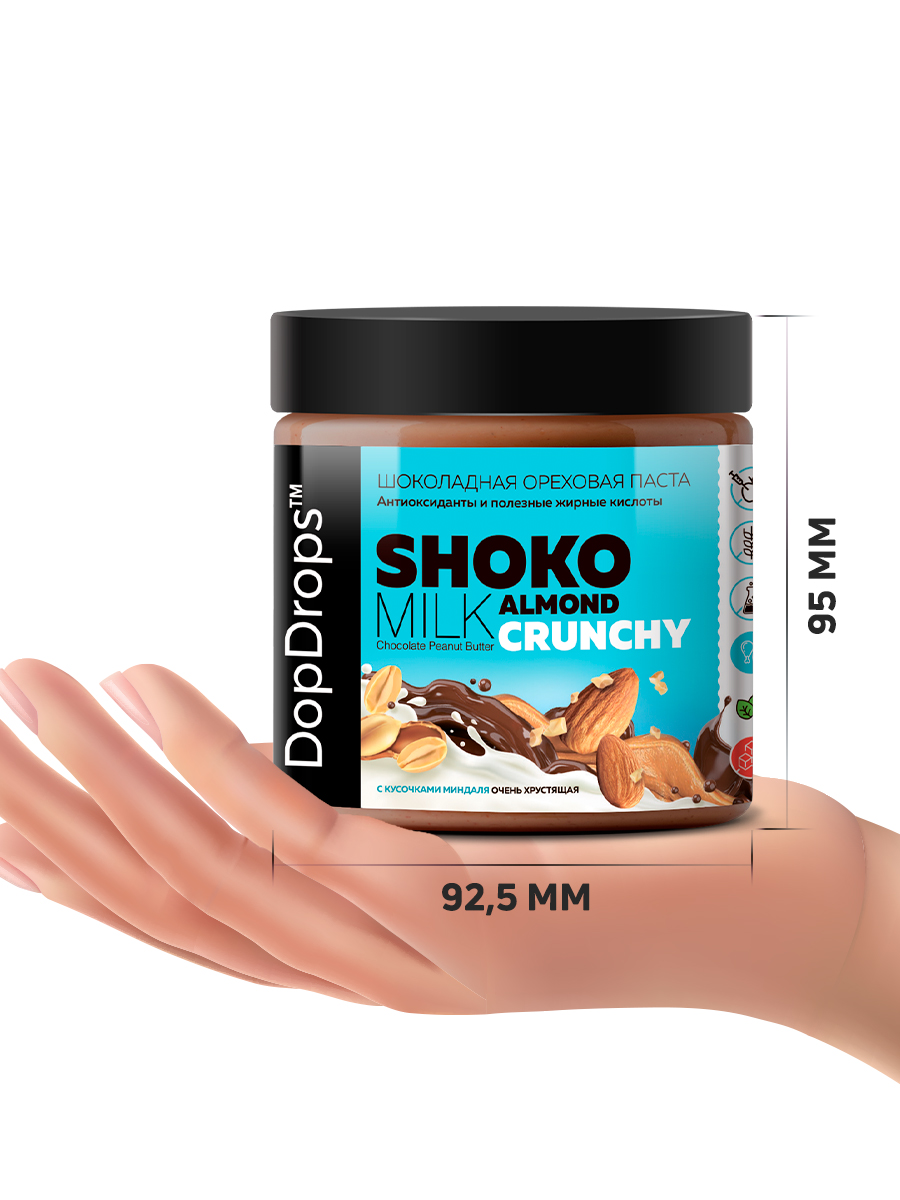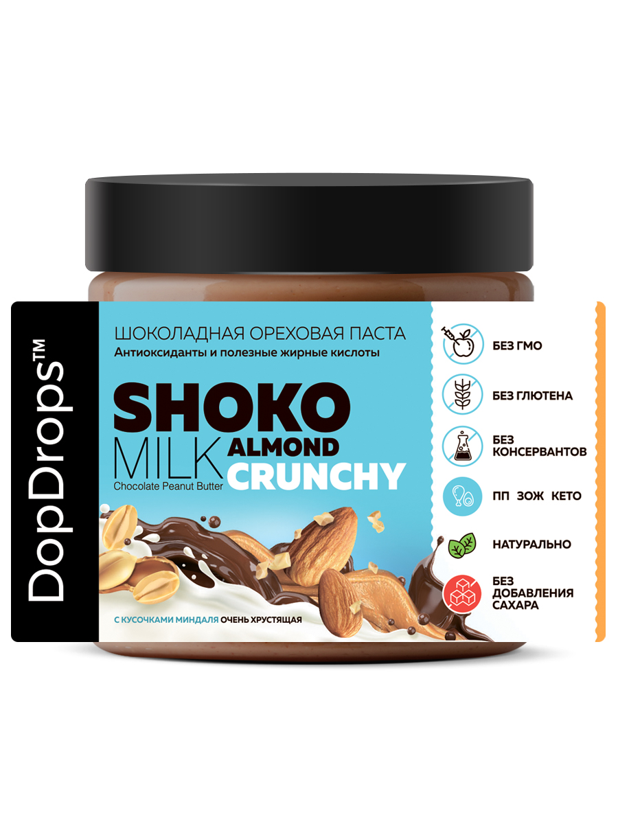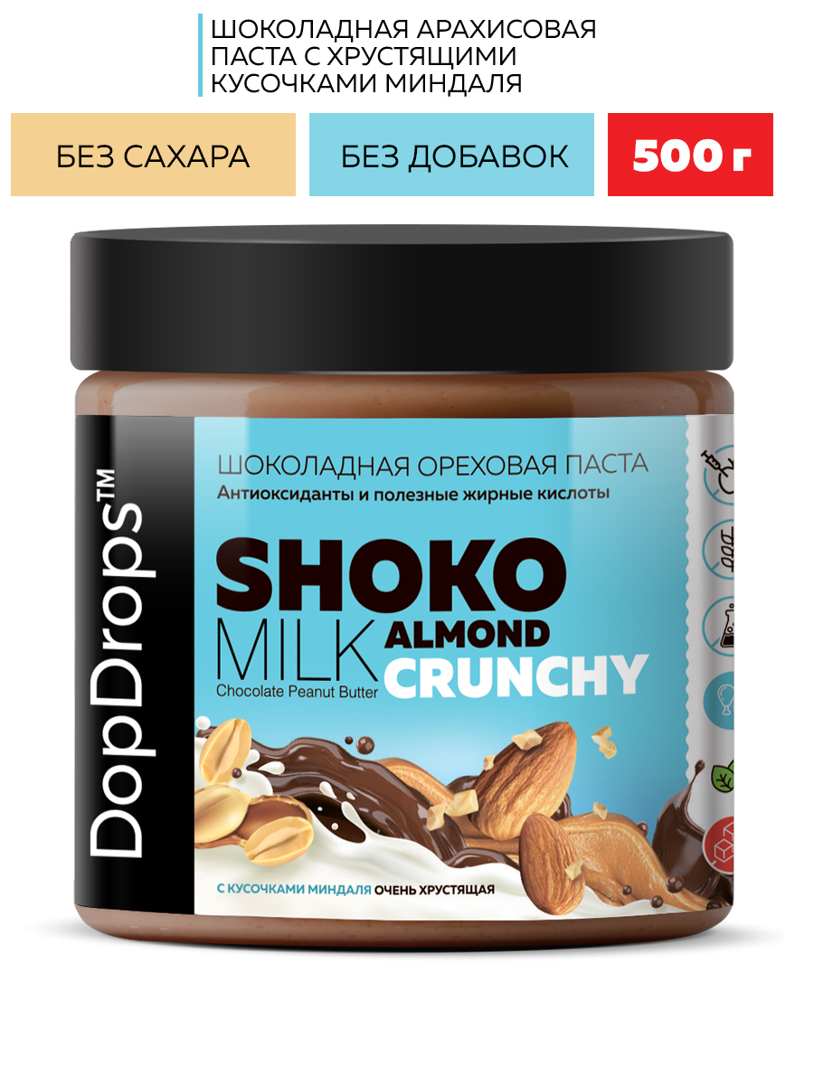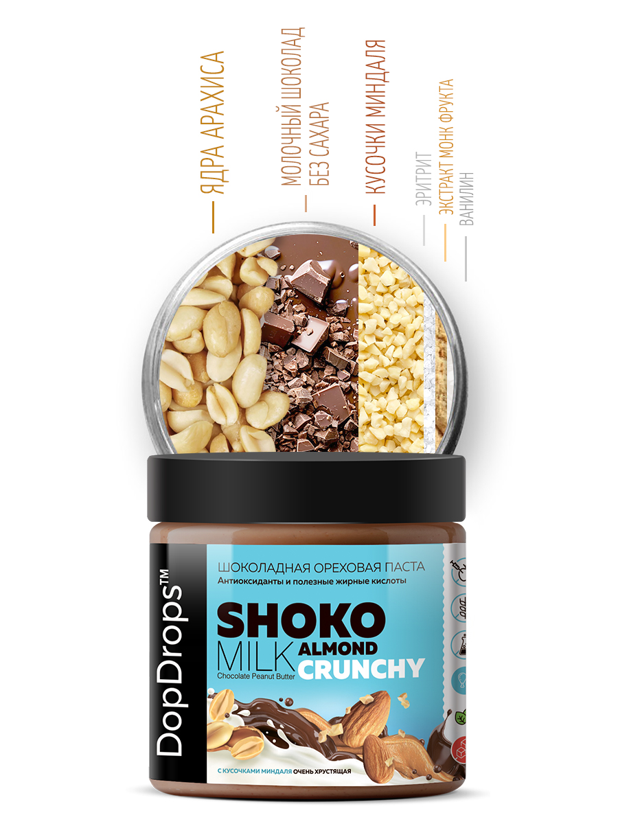 Паста DopDrops Shoko Milk Peanut Almond Crunchy – это шоколадное наслаждение, сочетающее в себе нежность арахисовой пасты и хрустящую текстуру благодаря рекордному количеству кусочков миндаля. Диетическая шоколадная арахисовая паста кранч с миндалем без сахара - отличный десерт и полезный продукт для всей семьи, который зарядит энергией на целый день.