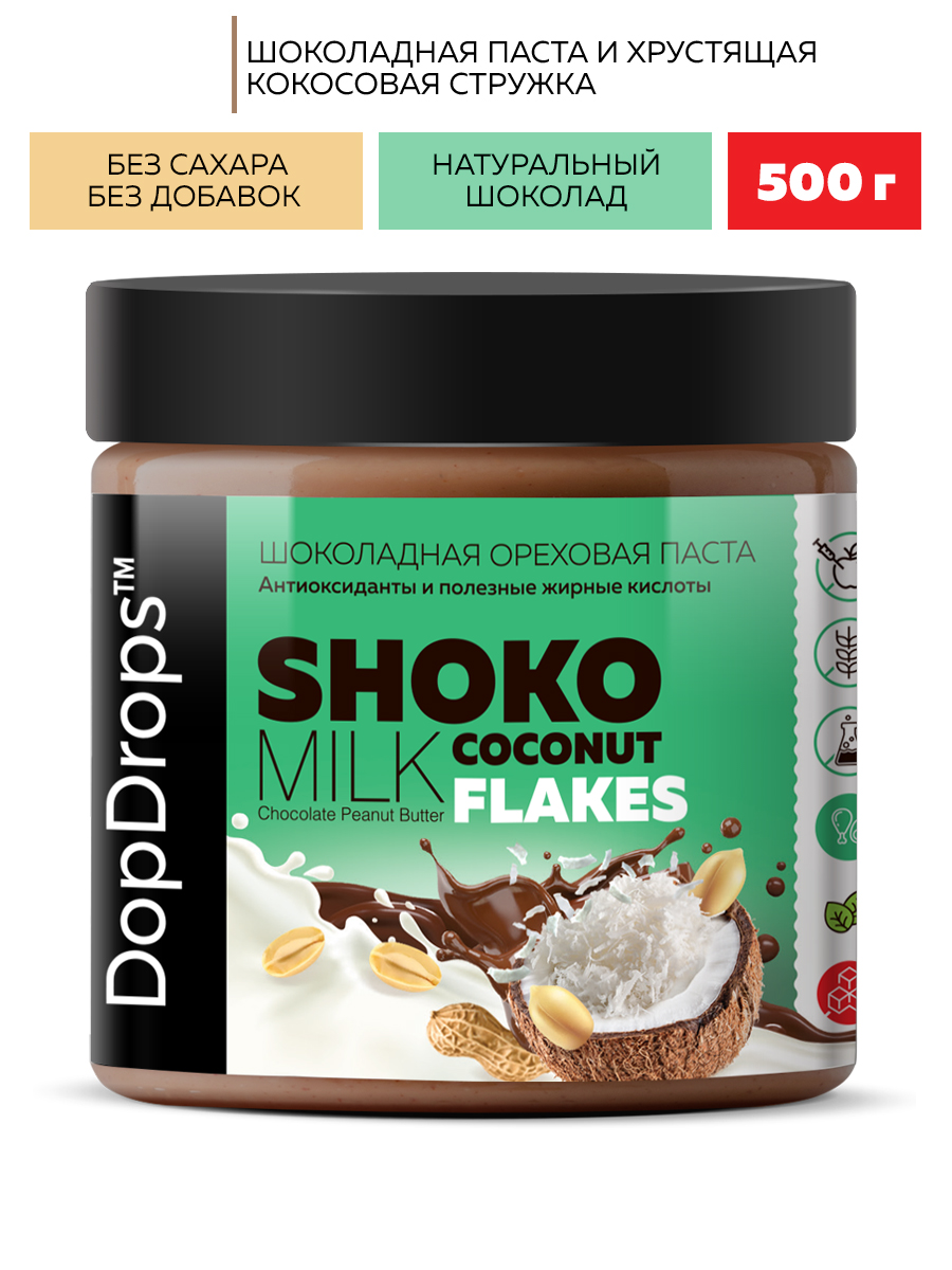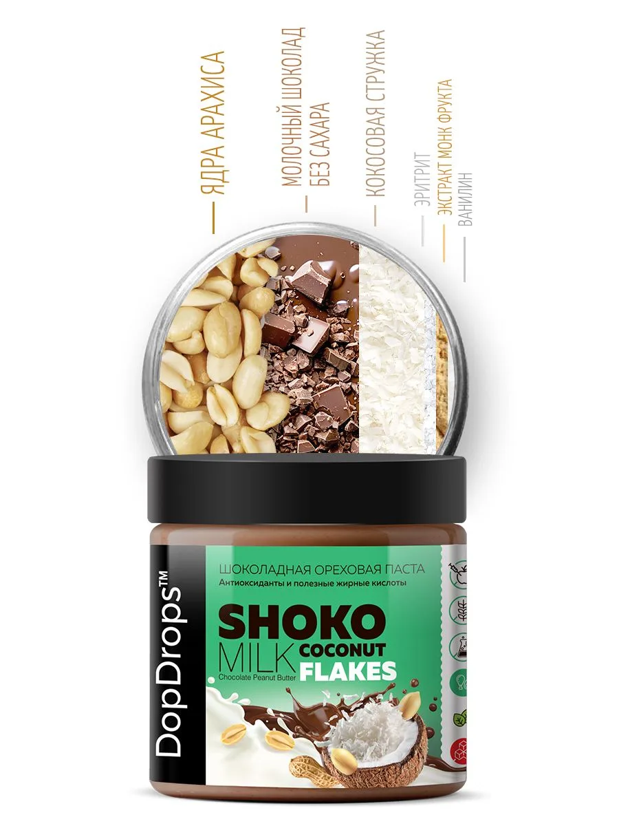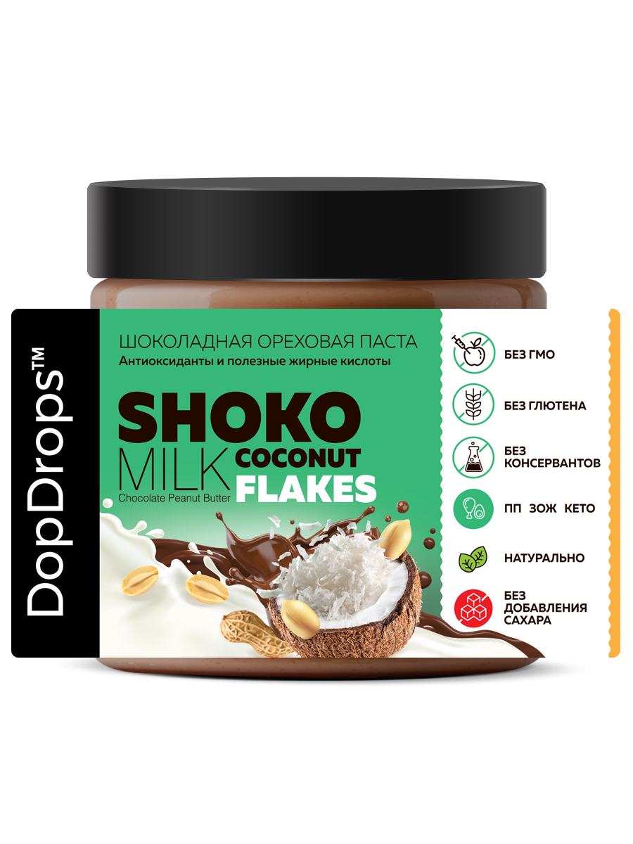 Шоколадно арахисовая паста DopDrops Shoko Milk Peanut Coconut Flakes с хрустящей стружкой кокоса настоящий подарок для любителей здорового питания и сладостей без сахара. Ореховая паста с насыщенным шоколадным вкусом, яркой ноткой кокосовой стружки и хрустящей консистенцией станет прекрасным дополнением вашего полезного питательного завтрака или вкусным и сытным перекусом, который восполнит ваши силы и придаст энергию.