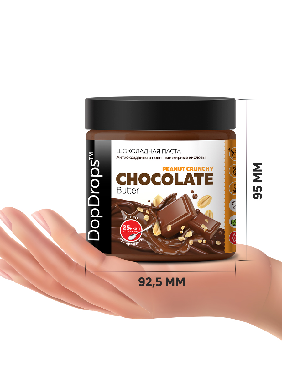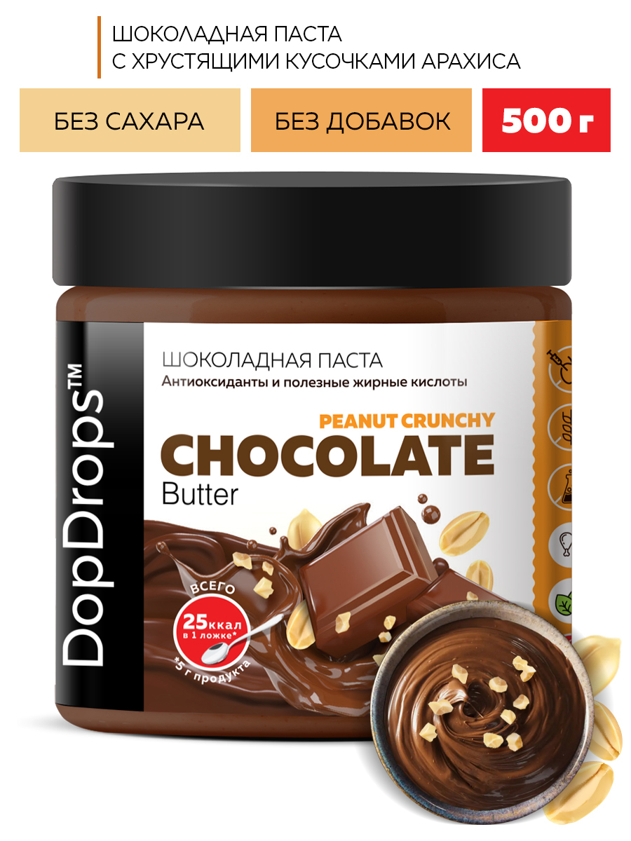 Шоколадная паста DopDrops Сhoсolate Butter Peanut Crunchy с хрустящим арахисом — это взрыв вкуса для тех, кто ищет сочетание натурального шоколада и настоящего орехового хруста без сахара! Паста идеально подходит для кето, правильного питания, спортсменов, диабетиков и всех, кто просто любит вкусные и полезные сладости.
