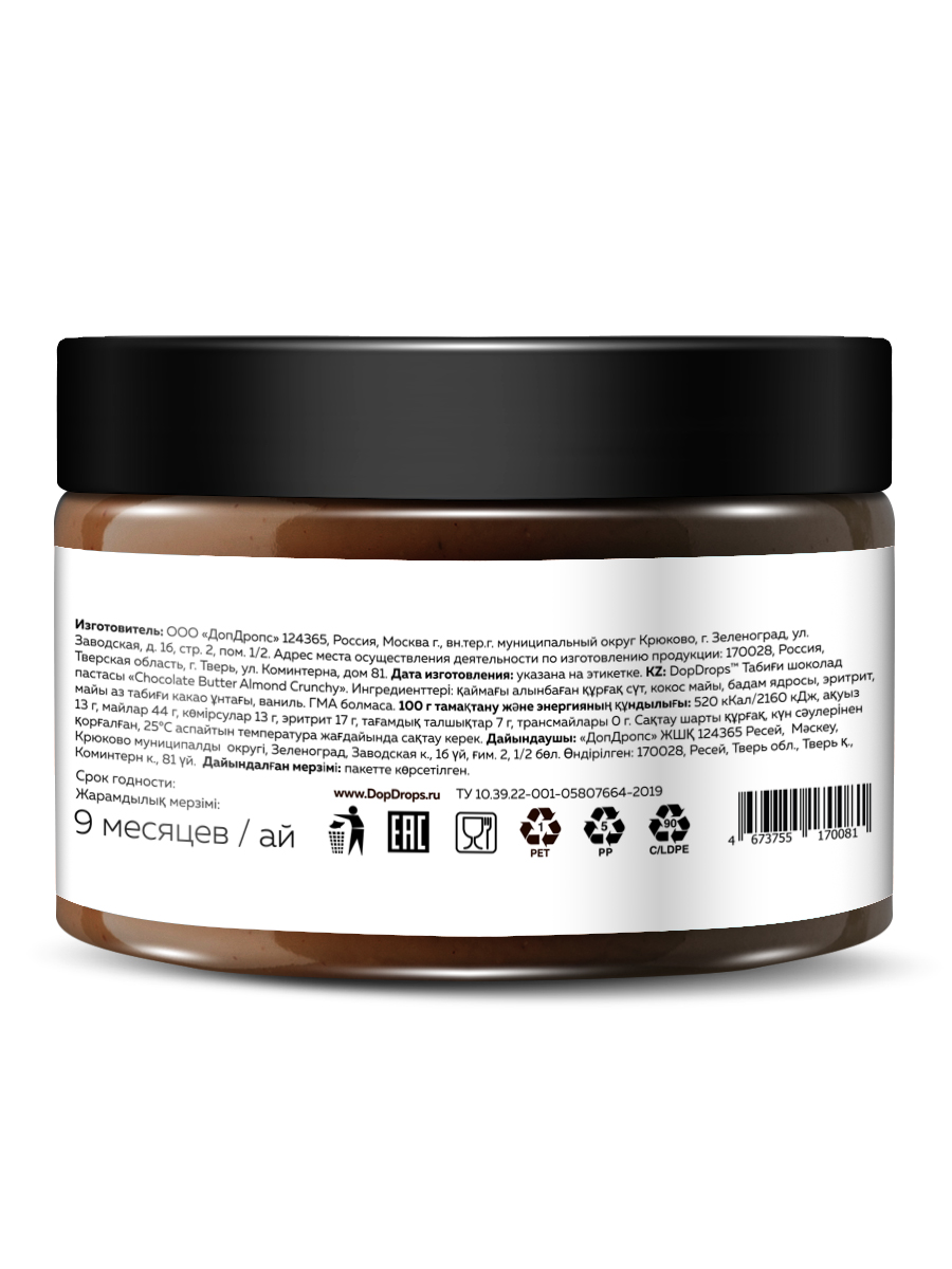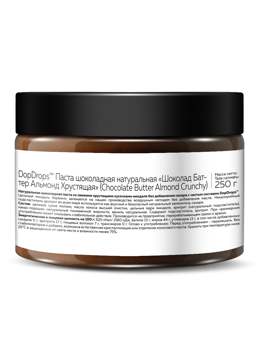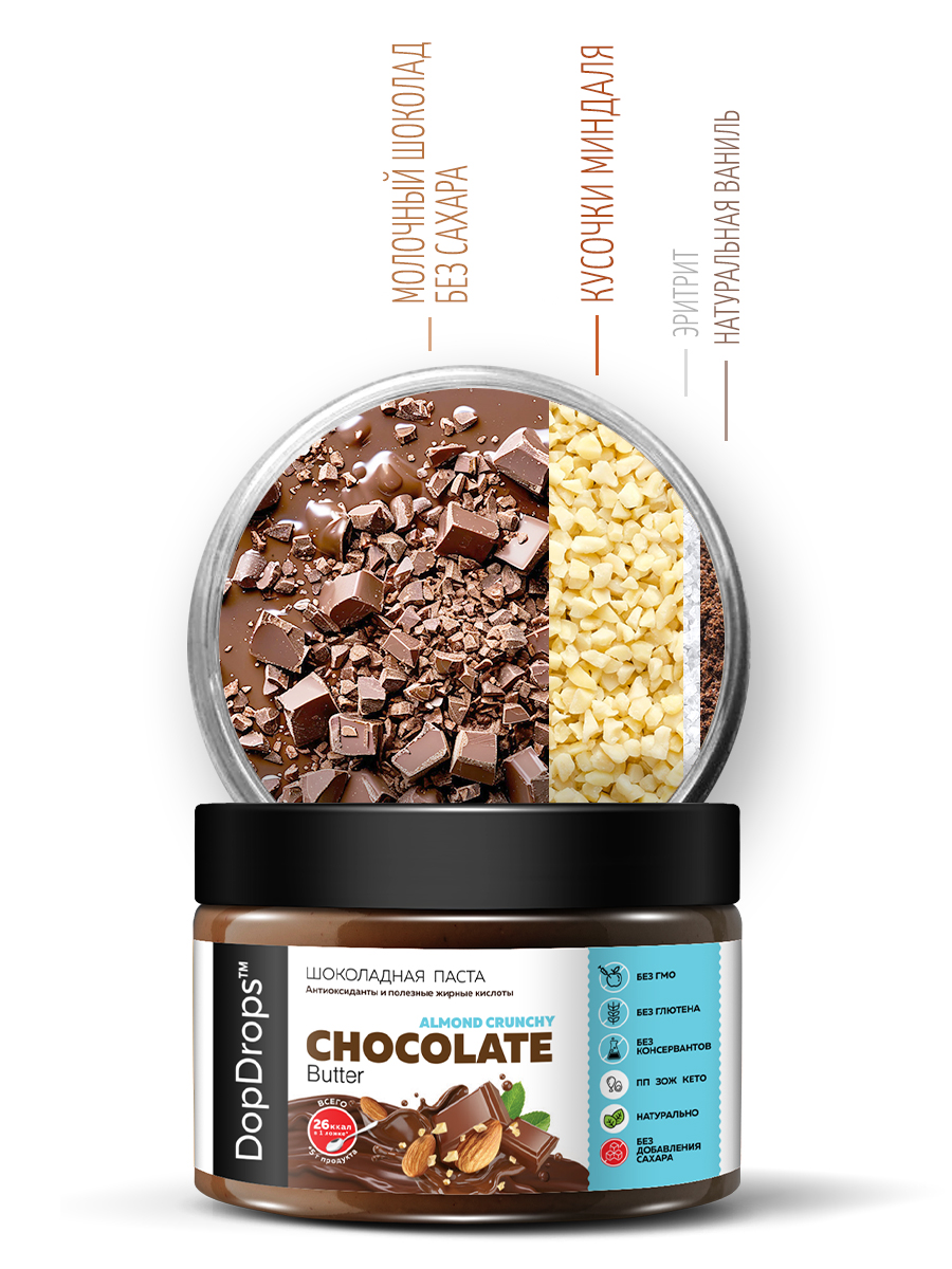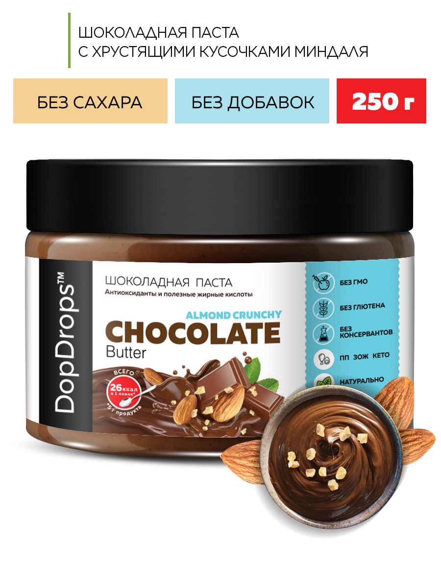 Выбирайте кето продукты нового поколения — паста шоколадная без сахара натуральная ДопДропс Chocolate Butter кранчи с миндалем. Оцените насыщенный вкус, натуральный состав и уникальную хрустящую текстуру!